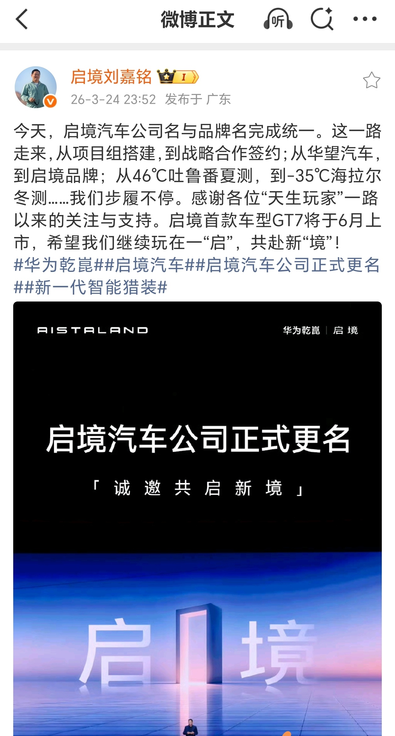 启境汽车 CEO 刘嘉铭发文谈及了启境汽车公司名与品牌名完成统一。他透露,启境首款车型 —— 华为乾崑 | 启境 GT7 智能猎装车将在 6 月上市。