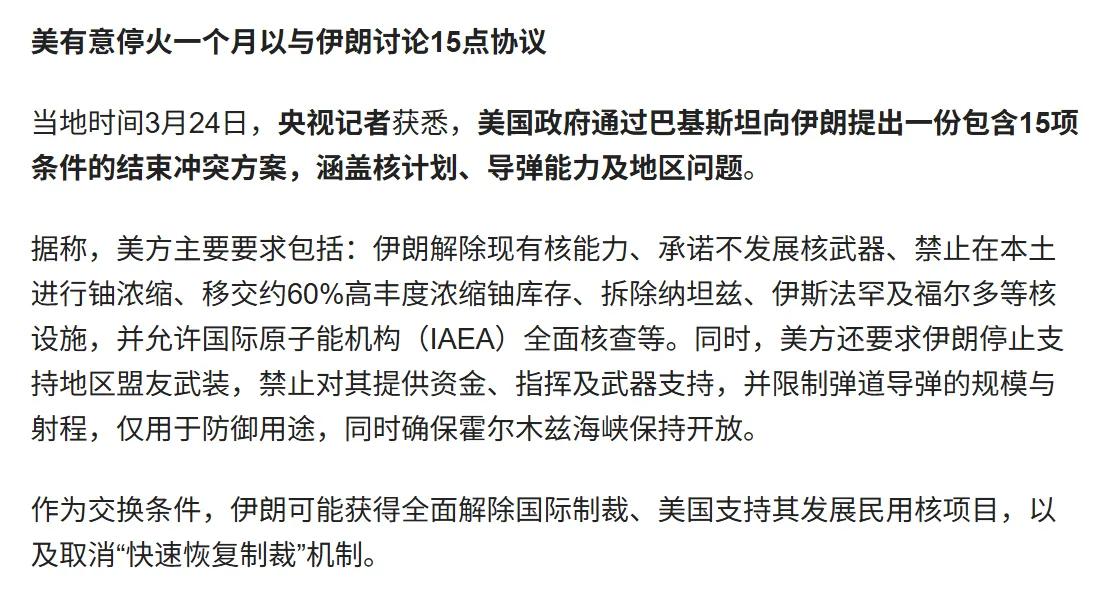 伊朗刚说不会谈判,美国就通过巴基斯坦,再向伊朗提出15条和谈要求 据央视新闻报道,美国通过巴基斯坦,向伊朗提出了一项和谈方案,其中包含了15条内容,为此美国愿意和伊朗先停火一个月,方便双方谈判。美拟推动停火1月 与伊朗和谈方案曝光 这场隔空递话的操作,藏着美国在中东局势里的多重算计,也让本就紧绷的地区博弈多了一层伪装的缓和色彩。近期美伊在霍尔木兹海峡周边的军事对峙持续升级,美军接连对伊朗境内的军事目标发起打击,伊朗也以对等行动做出强硬回应,双方的对抗已经进入白热化阶段,伊朗高层此前明确拒绝谈判,正是不愿在军事压力下接受不平等条款。 巴基斯坦成为这次传话的中间人,并非偶然选择。巴伊两国长期保持稳定的外交与经贸往来,同时巴基斯坦与美国也存在常规的安全沟通渠道,这样的双重身份让它具备了第三方斡旋的基础条件。美国放弃直接对话,转而借助第三方传递方案,本质上是不想放下霸权姿态,又想通过停火窗口期调整自身在中东的军事部署。 这份15条要求的核心指向十分清晰,全部戳中伊朗的国防与发展底线。方案要求伊朗彻底终止本土铀浓缩活动,移交高丰度浓缩铀库存,拆除多处核心核设施,同时全面限制弹道导弹的研发与部署,只保留基础防御能力。美国还要求伊朗停止对地区盟友的资金与武器支持,无条件保证霍尔木兹海峡的航运开放,这些条款几乎是要让伊朗放弃自主国防主权,完全妥协于美国的地区战略。 所谓一个月的停火期限,根本不是诚意求和的表现,更像是美国为自身争取缓冲时间的策略。白宫在释放谈判信号的同时,依旧在向中东增派海军力量与地面部队,军事打击行动也没有完全停止,这种边谈边压的做法,摆明了是想用短暂停火换取舆论主动,同时补充前线弹药与装备损耗,为后续更大规模的施压做准备。 伊朗的强硬态度有着现实的底层逻辑支撑。过往伊核协议的破裂让伊朗看清了美国的出尔反尔,任何涉及核心国防利益的让步,都可能让国家陷入安全被动。铀浓缩与导弹研发是伊朗维护自身主权的重要屏障,霍尔木兹海峡的控制权更是关乎国家能源安全与地区话语权,这些底线问题,伊朗不可能轻易松口。 全球能源市场也在为这场博弈买单,布伦特原油价格持续高位运行,国际航运成本不断上涨,霍尔木兹海峡作为全球能源运输的关键通道,任何局势波动都会传导至全球经济体系。美国看似在推动地区和谈,实际行动却在不断加剧动荡,完全无视中小国家的主权与全球共同利益。 这场由美国主导的间接谈判,从一开始就缺少平等对话的基础。15条苛刻要求搭配短暂停火的空头承诺,不过是美国霸权思维下的又一次施压手段,既没有尊重伊朗的主权诉求,也没有真正考虑中东地区的长久和平。 地区局势的走向,从来不是单一国家能强行操控的。平等协商、尊重主权才是化解冲突的唯一路径,靠霸权施压与虚假缓和,根本无法解决美伊之间的核心分歧,也难以让中东地区真正迎来稳定。 各位读者你们怎么看?欢迎在评论区讨论。