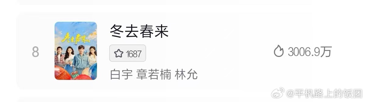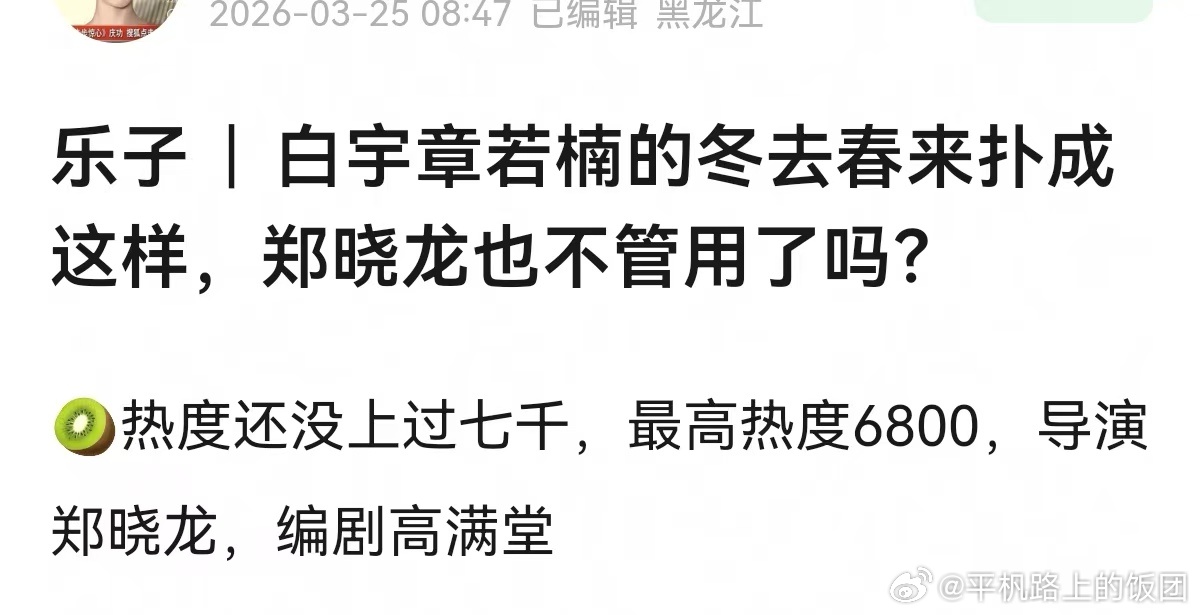 白宇章若楠冬林允去春来开播3天,🥝热度还没过7000,昨晚还出现死亡交叉,百指不要说过3万了,2万多还在一直下跌,下沉市场的🍠讨论度只有12万,抖的排名仅第8,热度刚刚过3000,官抖最新更新的视频点赞不过万,唯一一个热榜过万了评论却只有500多点😓白宇和章若楠,林允是真的没有一点剧粉啊,扑成这样太可怕了谁敢想这还是郑晓龙➕高满堂的顶级班底?