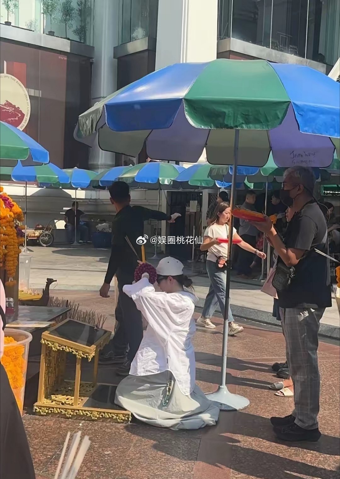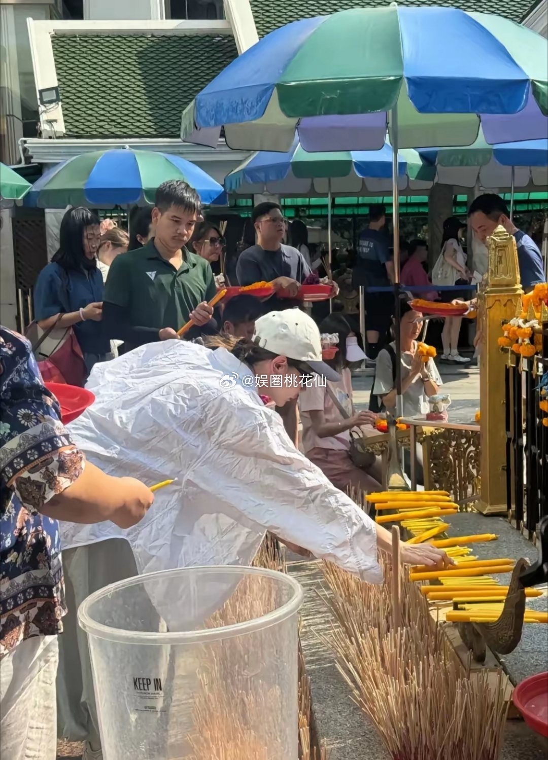 戚薇现身曼谷拜四面佛,李承铉现身陪同。戴着棒球帽的她,穿着白色衬衣配灰色宽松裙裤