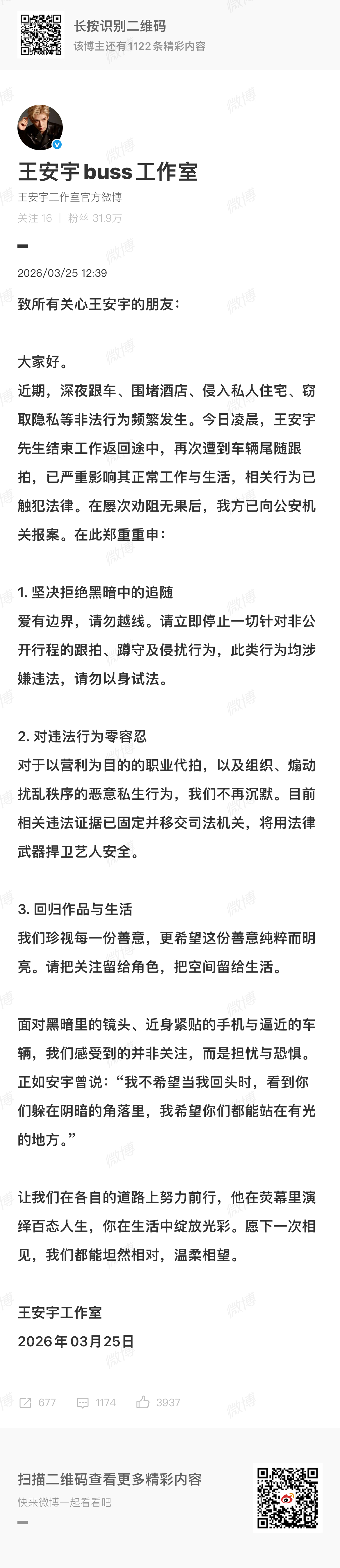 王安宇工作室发文:“ 在屡次劝阻无果后已经向公安机关报案,拒绝黑暗中的追随,对伟法行为零容忍,回归作品与生活。”