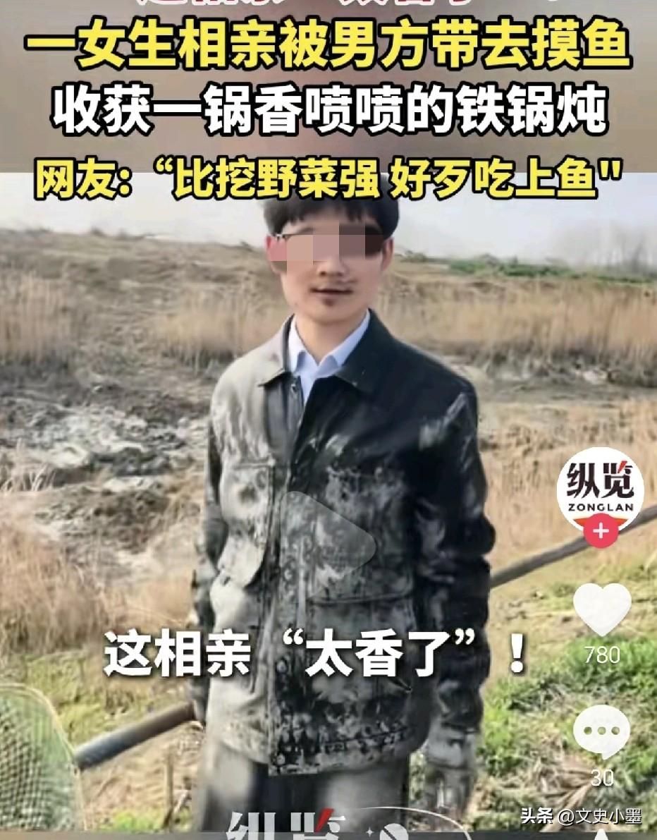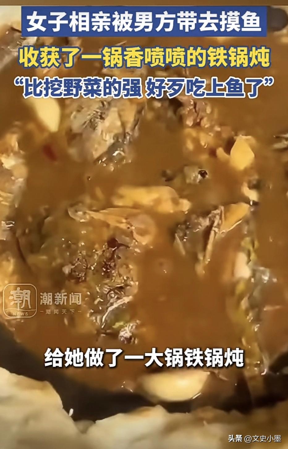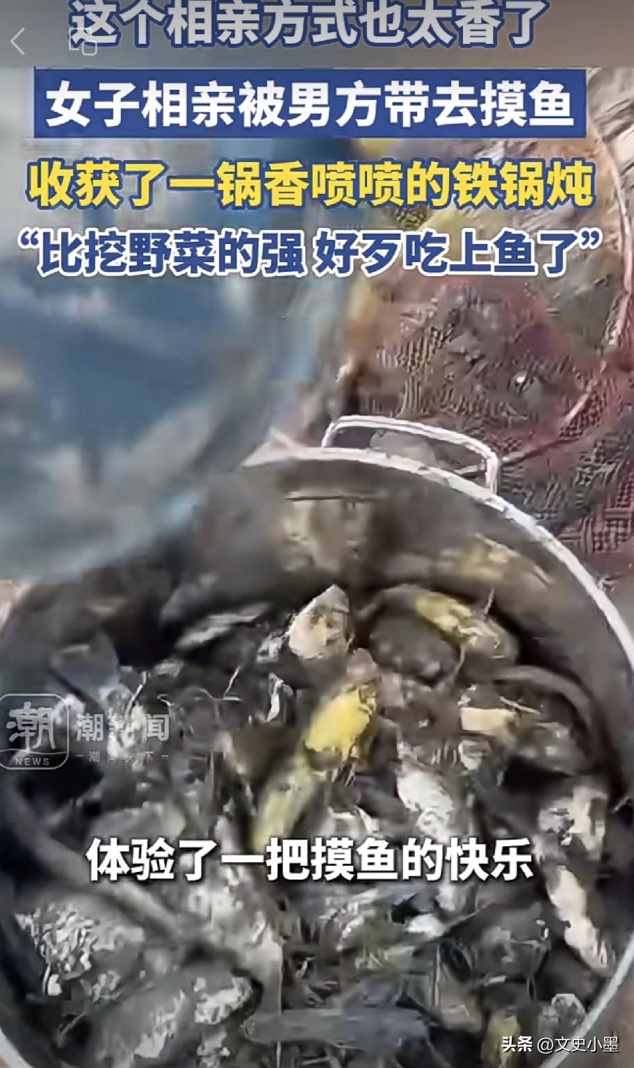 近日,安徽一女子去见相亲对象,两人寒暄几句后,男子提出在这春暖花开的季节,要带女方去做一件特别的事,下水摸鱼!女方没有拒绝,反而觉得非常有趣,愿意跟男方去摸鱼体验生活! 他们来到一处坑塘,男方用提前准备好的抄网开始捞鱼,他动作娴熟,捞的非常起劲,没多久便捞了一铁锅!女方比较惊讶,没想到男方穿着正式,戴着一副眼镜,表面看起来比较斯文,捞鱼技术却非常了得! 最后,男方把摸到的鱼炖了,做了一锅香喷喷的铁锅炖鱼,女方非常高兴,既收获了快乐,也填饱了肚子! 相亲小伙没有跟女方去吃饭,看电影,逛街,而是选择用一种非常朴素有趣的捞鱼活动,来拉近双方的距离,期间虽然弄的满身是泥,但最后也是收获满满,通过捞鱼向女方证明了自己既能吃苦,也会做饭,更会给枯燥的生活添加不一样的乐趣! 有人说这比带相亲对象去挖野菜的实用多了,最起码女方吃了一顿大餐!而挖野菜的男生把挖到的野菜全带回家了,事后还炫耀妈妈做的荠菜疙瘩好吃,女生一点没捞着!
