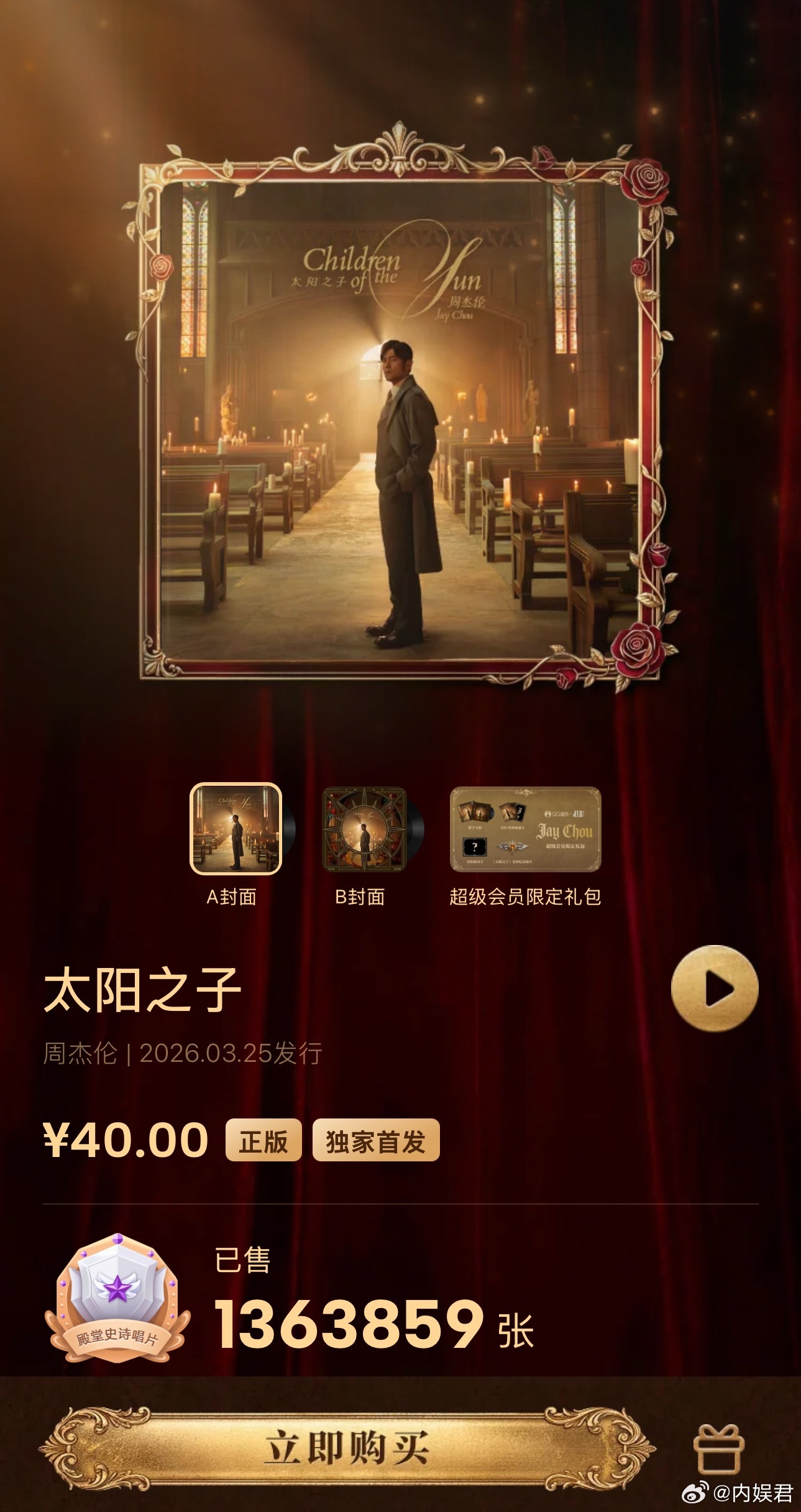 周杰伦新专辑年榜第一 周杰伦全新数字专辑《太阳之子》发行首日,销售额成功登顶2026年年榜!果然还得是周董,只需略微出手第一就拿到☝️