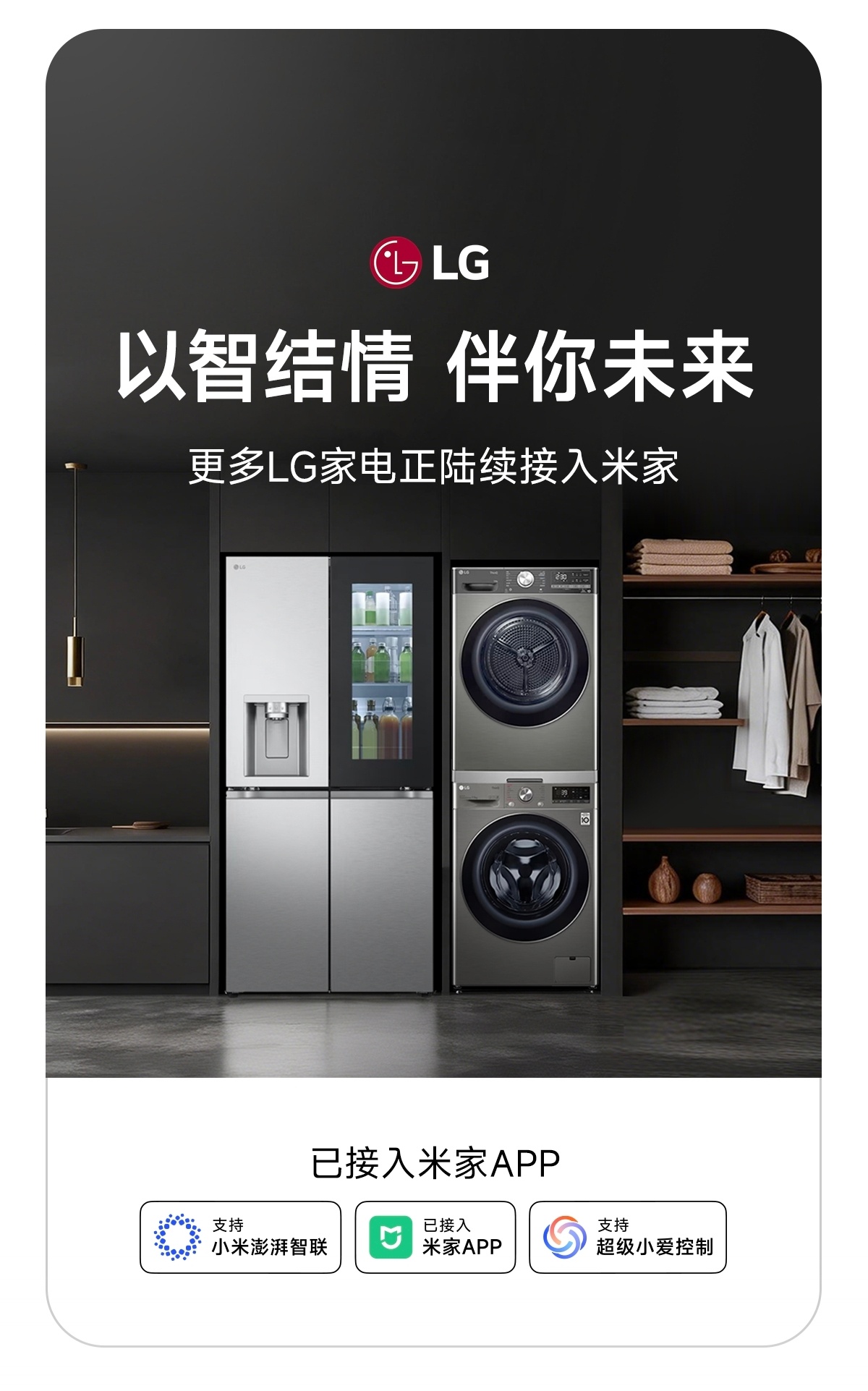 目前已接入的产品包括 LG 洗衣机、烘干机、冰箱等,支持小米澎湃智联,支持超级小爱语音控制。
