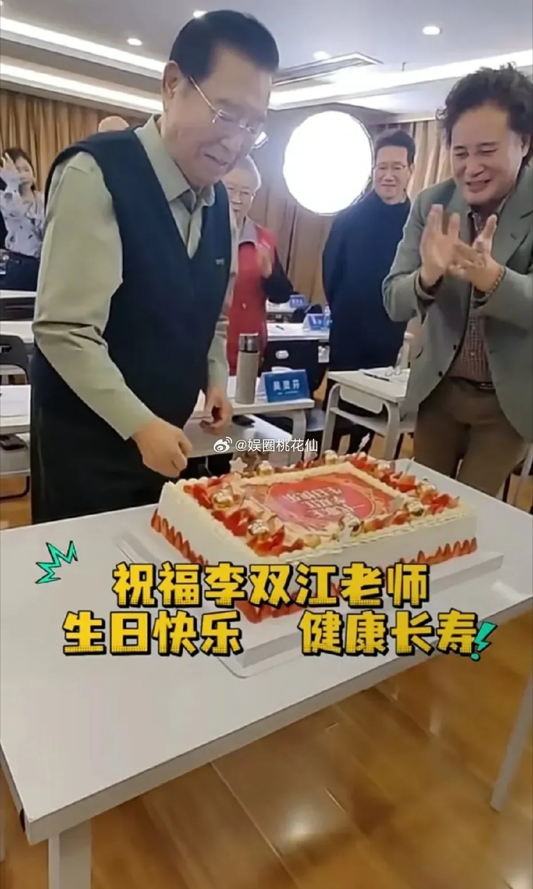 著名男高音歌唱家李双江迎来87岁生日,他的学生以及圈内诸多好友纷纷现身,一同为他庆贺生辰,现场氛围暖意满满。当天李双江身着绿色长袖军衣,外搭针织背心,还戴着一副老花镜,虽身形略显佝偻,但头发染成了黑色,整个人看着精神了不少,状态十分不错。桌上摆着生日蛋糕,蛋糕上醒目地写着“一代歌王,李双江,生日快乐”,满是敬意与祝福。徒弟戴玉强在旁帮忙切蛋糕,妻子梦鸽则轻声唱着生日歌,陪伴在侧,画面格外温馨。自从小儿子出狱后,李双江的心情明显愈发舒畅,整个人的状态也比以往好了太多,眉眼间尽是轻松愉悦。