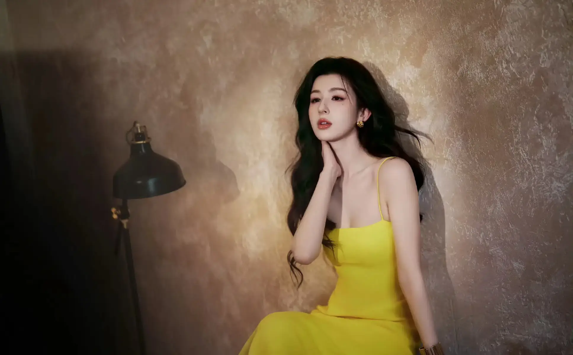 哈妮克孜穿明黄裙 大波浪发型明艳靓丽