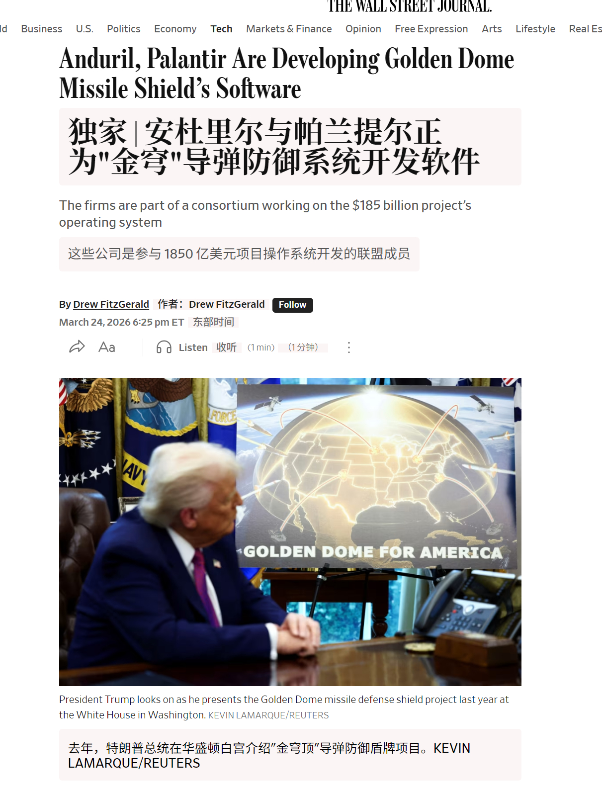 🔻华尔街日报:安杜里尔(Anduril)与帕兰提尔(Palantir)正在开发“金穹”导弹防御系统软件,这两家公司是负责该耗资 1850 亿美元项目操作系统开发的联盟成员。🔻这些此前未被公开点名的公司,属于一个由国防和科技公司组成的联盟,该联盟的目标是在今年夏天准备好“金穹”软件以供测试。🔻参与该项目的还包括网络公司 Aalyria Technologies(其技术源自谷歌母公司 Alphabet)、人工智能初创公司 Scale AI,以及软件公司 Swoop Technologies。🔻如果该软件在实地演示中表现成功,它可能成为这个价值 1850 亿美元防御系统的核心,从而为其开发和长期维护带来数十亿美元的潜在收益。🔻软件交易已成为美军采购活动的重要组成部分。本月,安杜里尔公司赢得了一份为期 10 年、价值高达 200 亿美元的合同,负责整合美国陆军多个项目的工作。🔻在去年“金穹”软件开发财团成立后,五角大楼项目负责人、美国太空军将军迈克尔·古特莱恩又引入了传统国防承包商洛克希德·马丁、诺斯罗普·格鲁曼和 RTX 公司参与操作系统开发。该软件重要性的一个标志是:它是唯一由古特莱恩办公室直接管理的金穹项目。空军、导弹防御局及其他国防部机构正在负责其他金穹项目。该软件项目的另一个新颖之处在于:传统上直接与五角大楼交易的国防公司,在该联盟中充当了科技公司的分包商。🔻笑死,又是安杜里尔。白手套都不换一下的吗?海外新鲜事热点现场