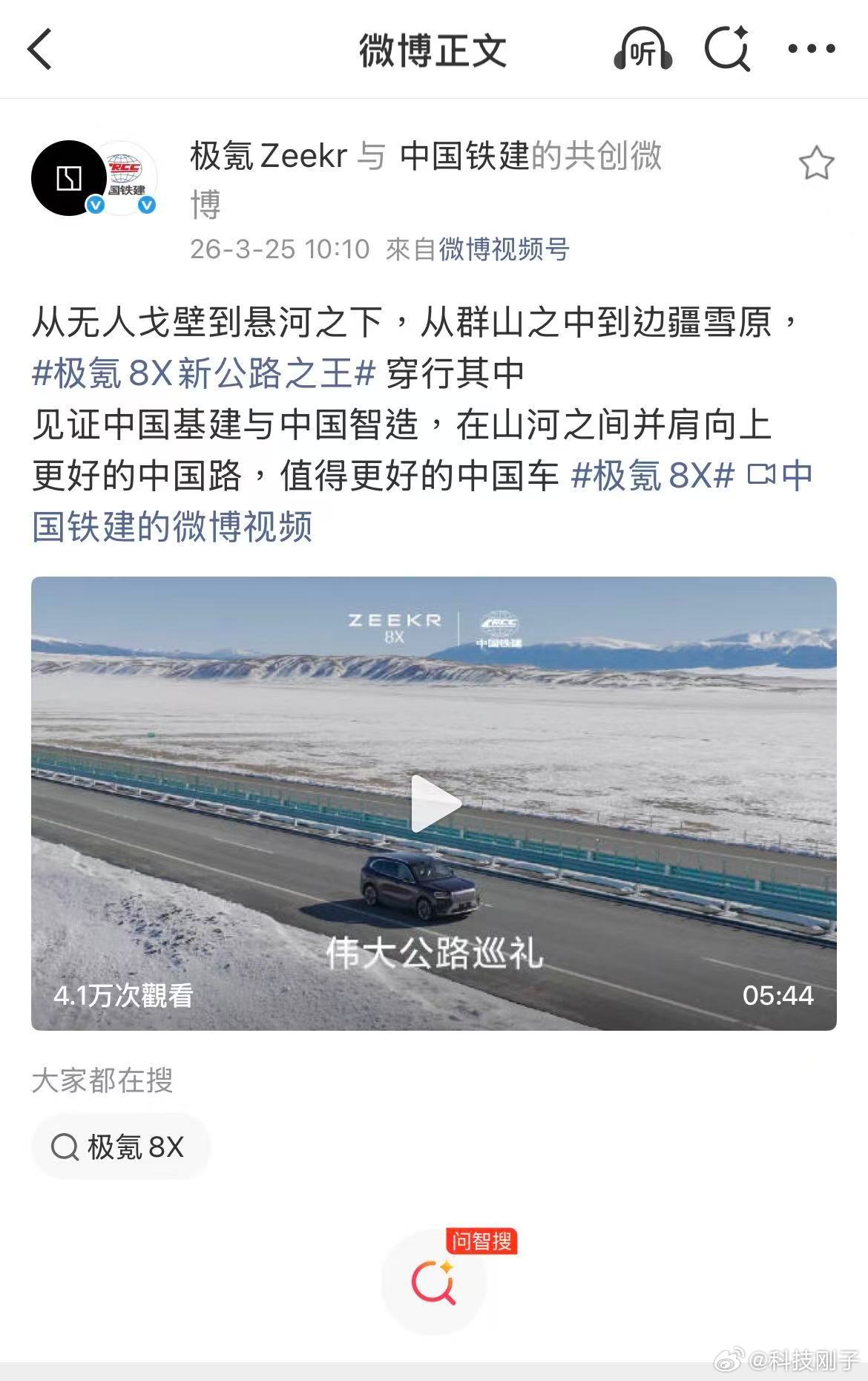 极氪回应中铁建邀请 当中国智造遇上中国基建,这场跨界联动真的太提气了!《伟大公路巡礼》里,极氪8X驰骋在无人戈壁、悬河之下、群山高桥与边疆雪原,每一段路况都是对车辆性能的极限考验。
