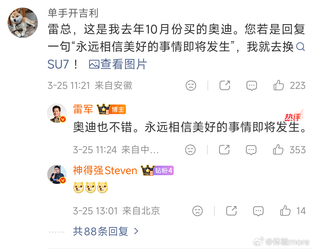 雷军一句话卖出一辆车哈哈,这就是销冠的魅力。销冠雷总也顺便夸了奥迪也不错,有格局。