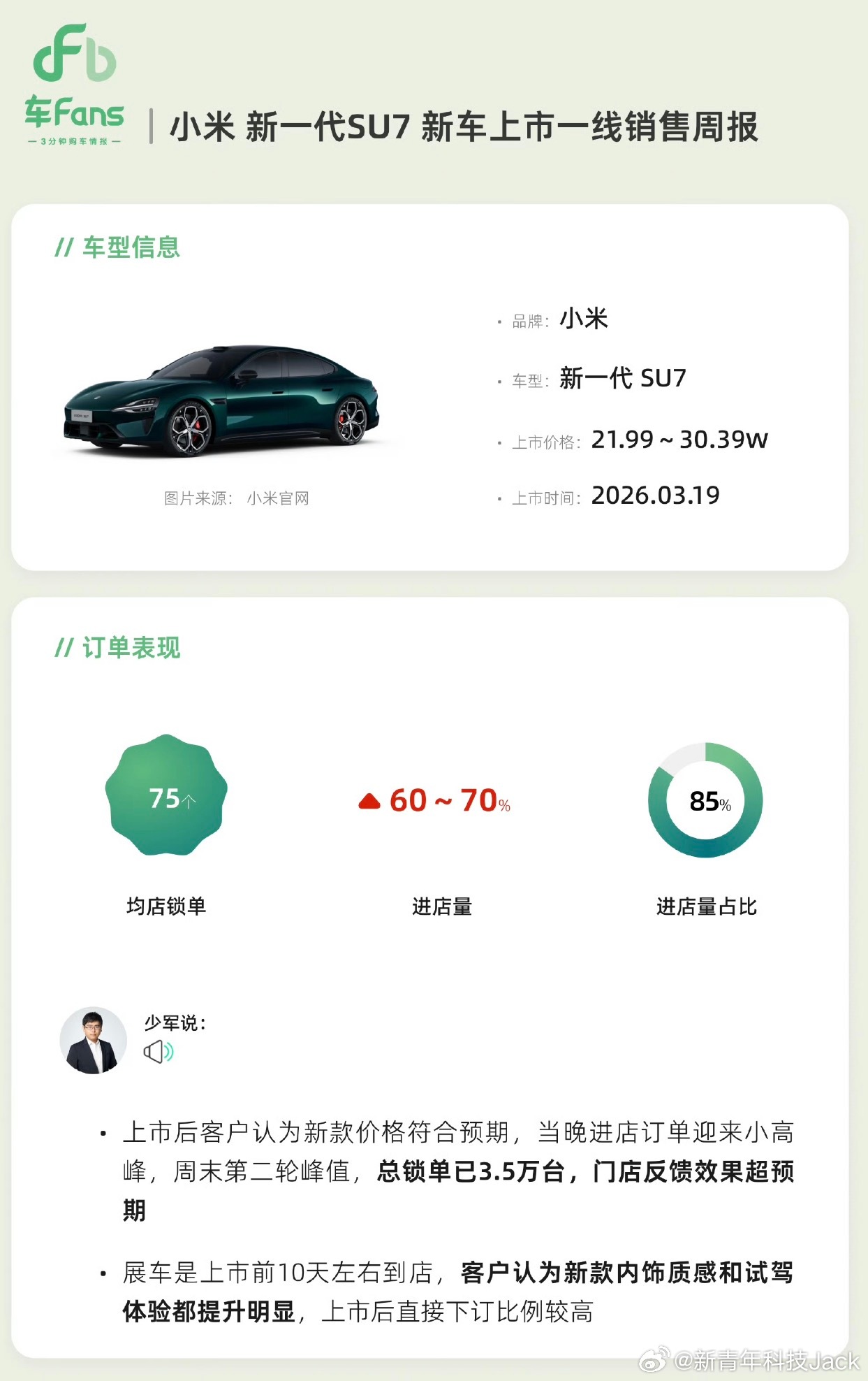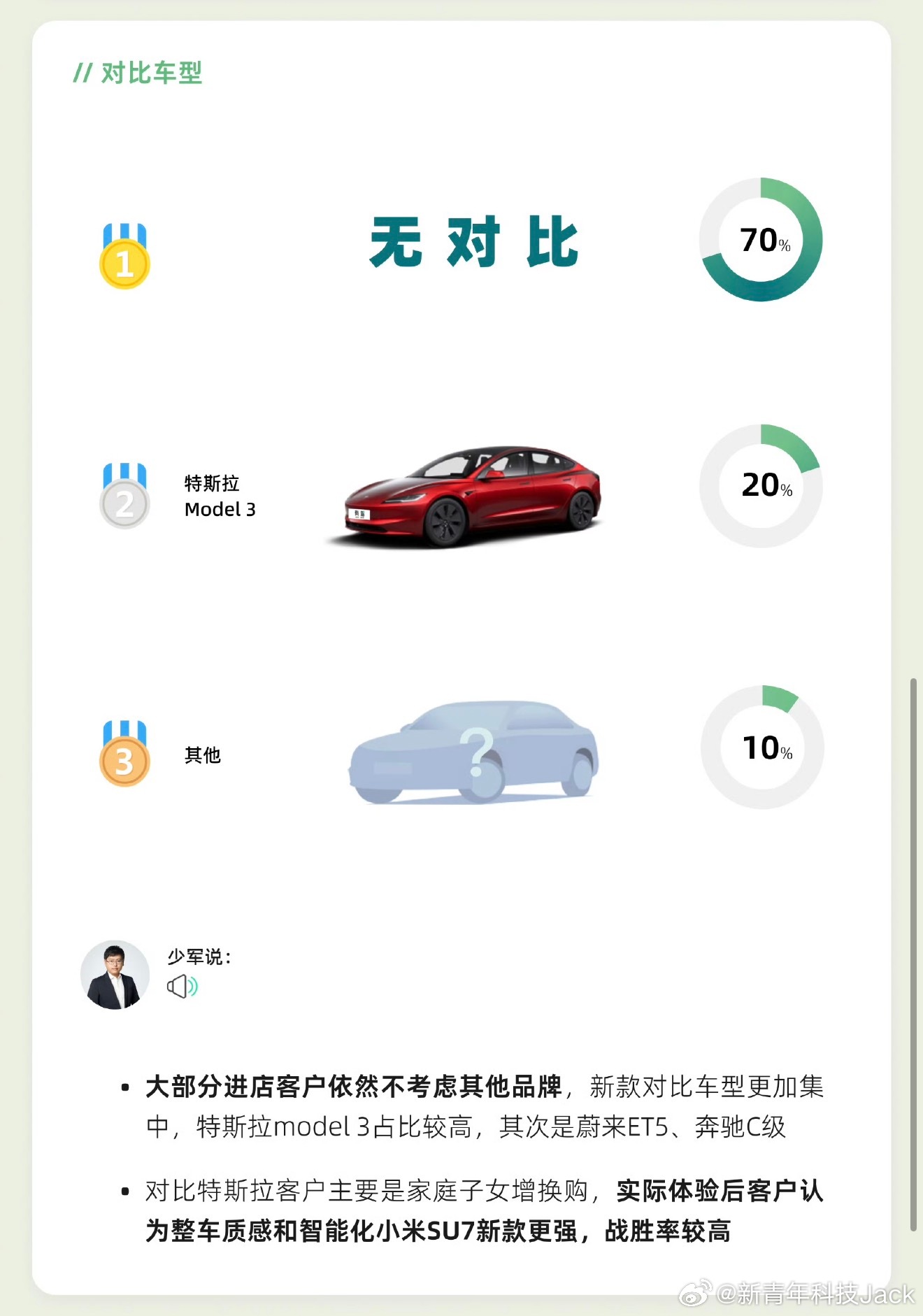 看了下小米新SU7销售周报以及门店情况,基本上7成进店客户不考虑其他品牌车型,就是奔着小米来的,也可以说要不是小米他们可能都不会买新能源车或者换新车。从这个数据来看,小米是在扩大盘子激活更多新需求,而不是在已经有的盘子里内卷抢用户。