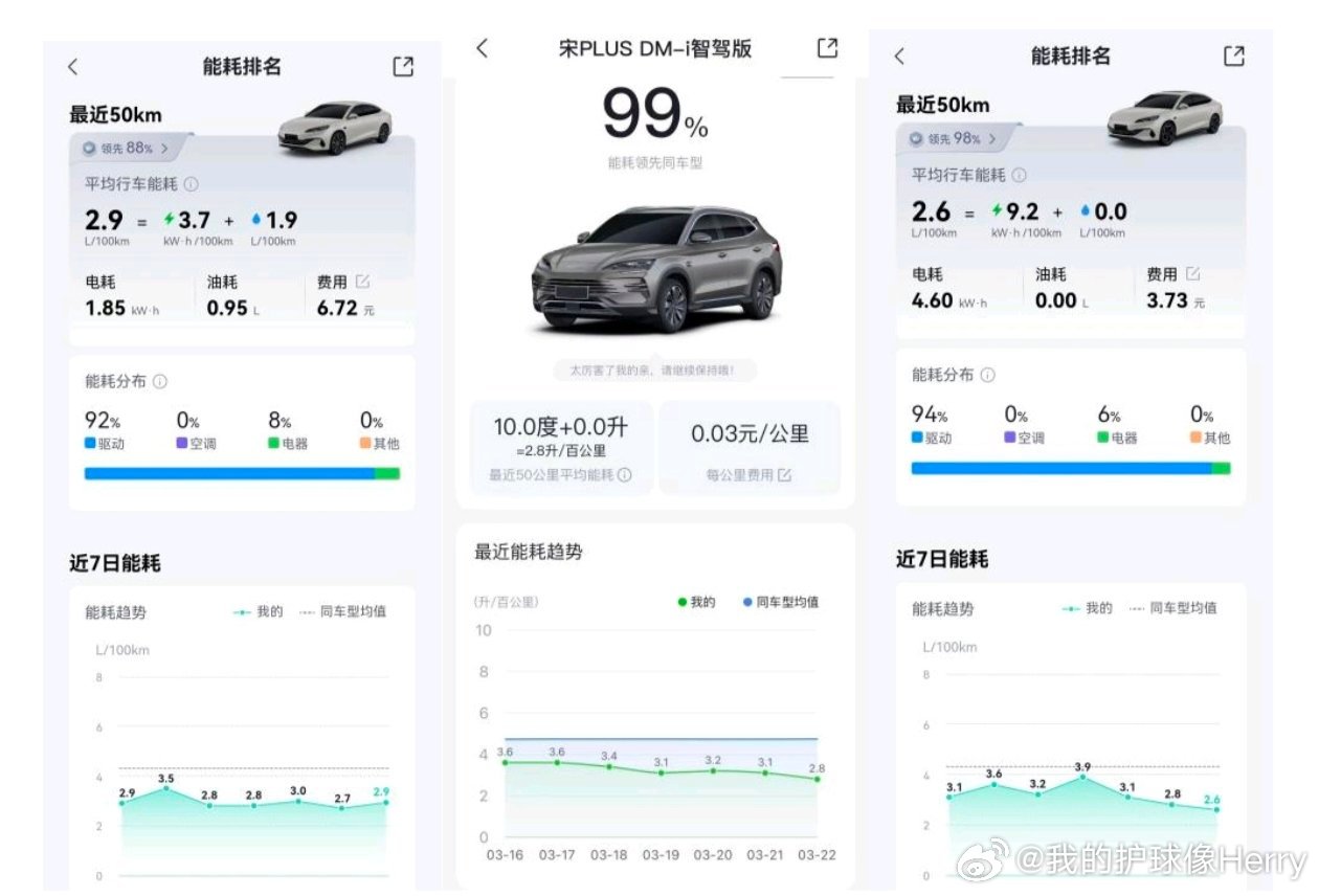 油价大涨,比亚迪车主爽了,真实花费多少?上上次加油,中石化92号汽油6块多,23日加7.6元,24日涨到了8.5元,从过年到现在油价真是止不住的涨啊,这还得亏国家有兜底政策。不然真是受不了。身边几个开比亚迪插混的又爽了,嘚瑟说,油价涨不涨和他们没啥关系,去年加了一箱油,今年还省一半,就怕油过期。真是冰火两重天啊。看了一下,几个比亚迪插混车主的真实花费。开50公里,一个花了6.72元,一个花了3.72元,另一个平均一公里3分钱,50公里就花了1.5元。拿秦Plus DM-i的210公里续航版来说,售价不到9万,配25度左右的电池,家用桩充电,0.5元一度电。充满一次花12.5元跑200公里,一年2万公里也就1250元。紧凑级燃油车,油耗7.5,油价8.5,跑两万公里得花12750元。差的真不是一点半点。实在需要用油的场景,像比亚迪秦L,秦Plus,海豹06,海豹05这些车,亏电油耗2.6升,基本就是燃油车的三分之一。插混的好处就是想用油用油,想用电就用电,很自由,插混从从容容游刃有余。而且综合续航也是插混的优势,像比亚迪秦L,综合续航能干到2145公里,从北京到上海,中间也用不着再加油充电。油价上涨的时候就去充电,充电桩排队的时候就去加油,灵活的选项确实很好。中东这一块的局势看起来一时半会还停不了,油价应该一时半会也降不下来,这种情况下,其实比亚迪插混就是不错的选项了。关键是车不贵,没有太多门槛。平时用省钱,续航也长,加油加电都掌握在自己手上。油价的涨跌也就无所谓了。不知道大家觉得比亚迪插混怎么样,在油价大涨的局面下,是不是挺有优势?
