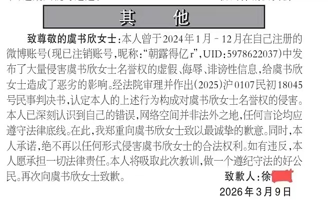 虞书欣名誉权案被告登报致歉 虞书欣告嘿,人民法院报登报道歉