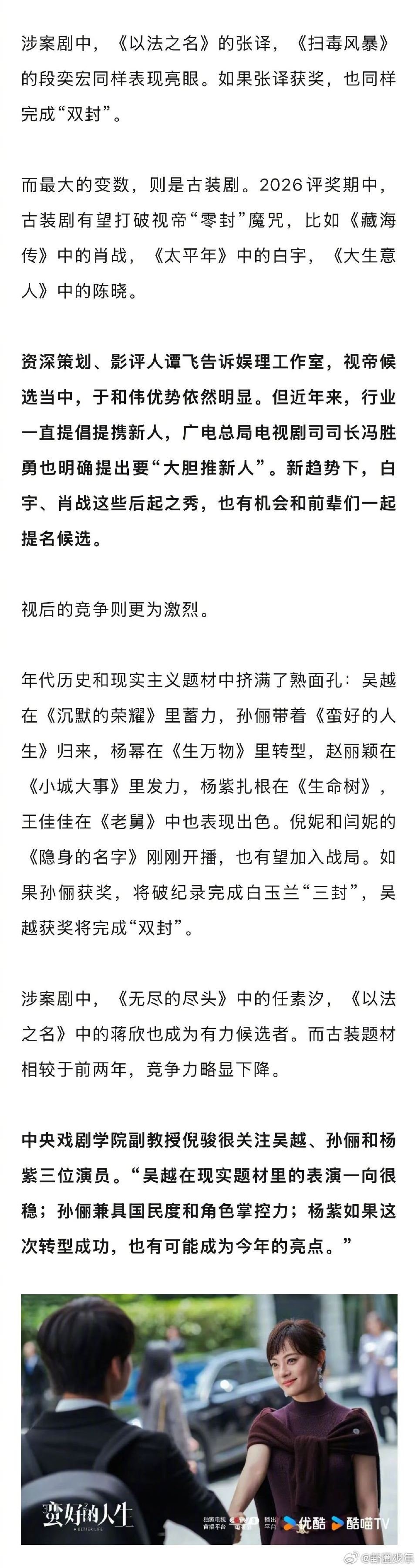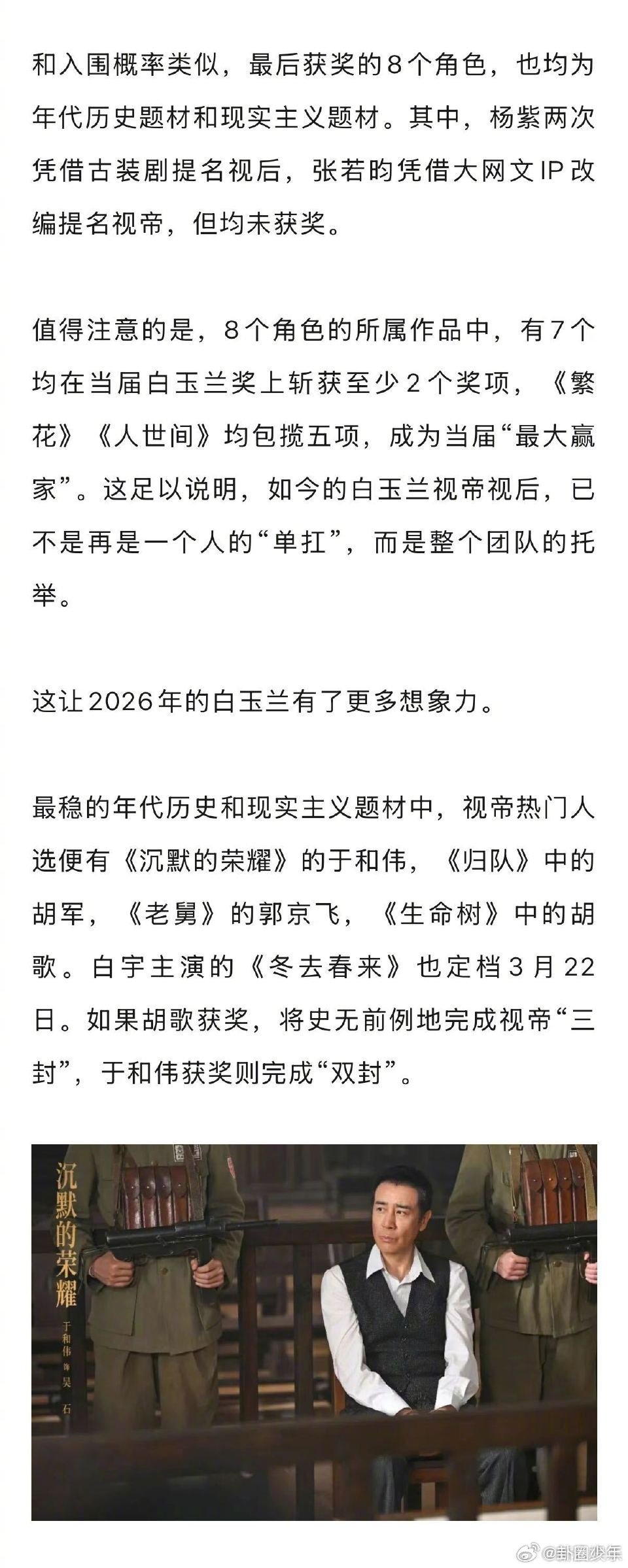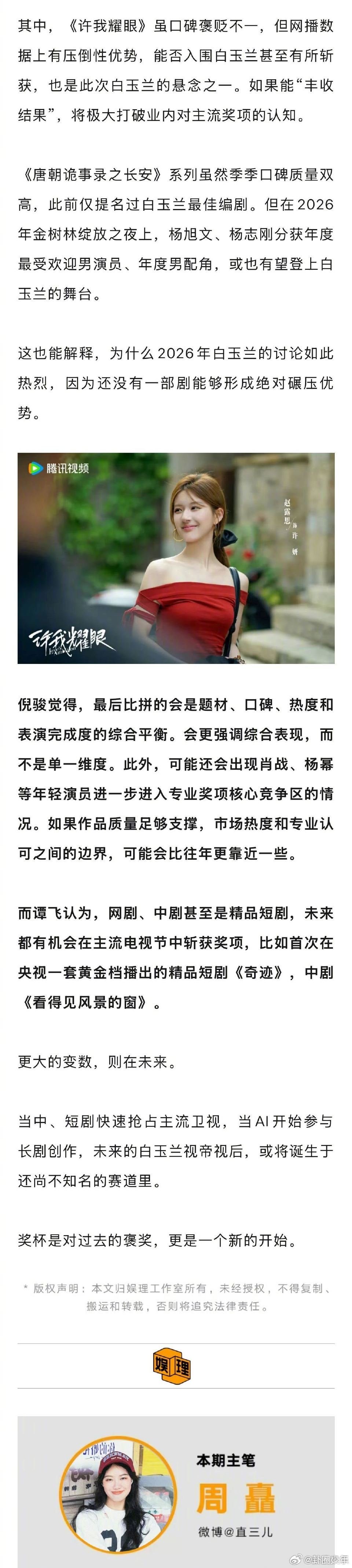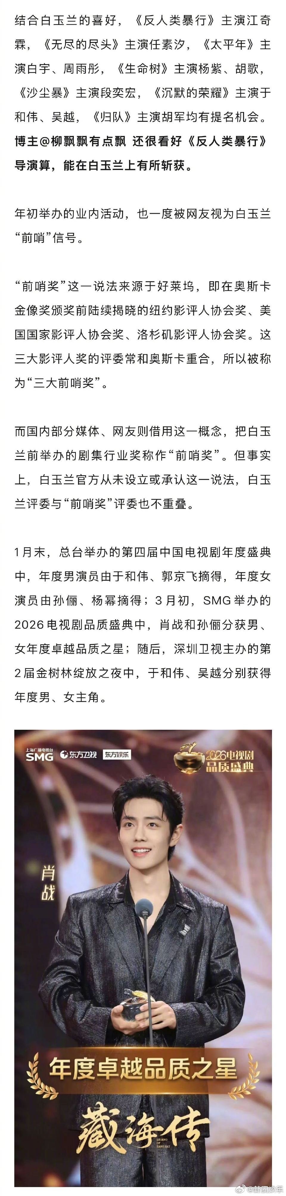 业内谈肖战杨紫白玉兰拿奖几率肖战杨紫白玉兰拿奖几率白玉兰奖历来对现实主义题材有明显偏好,近五年古装剧视帝获奖率不足20%,肖战凭借古装权谋剧《藏海传》斩获SMG最年轻视帝,剧集热度口碑双高且实现文化出海,但仍需面对题材壁垒与现实题材强敌,杨紫则以《生命树》中高原女警角色突破自我,作品获央视与广电总局肯定,不过视后赛道竞争激烈,二人拿奖均需突破多重考验,业内预测需综合题材适配度、表演质感与评审偏好多维度考量