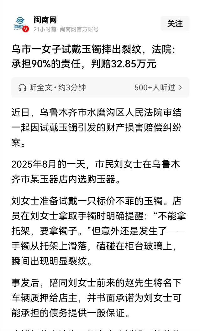 乌鲁木齐一女子在玉器店看中高价玉镯,店员提醒其正确拿取方式,女子未听从导致手镯磕碰受损。经鉴定损失36.5万元,女子以手镯原有瑕疵、店家未尽安全义务为由拒赔,法院一审作出判决。 一道裂纹,值36.5万。 2025 年 8 月,乌鲁木齐一家玉器商铺内,一只标价数十万元的翡翠玉镯陈列于展示架上。灯光打下去,翠色流转,一看就是镇店级别的货。 刘女士进店后转了一圈,最后目光落在那只镯子上。店员小心翼翼地把它取出来,轻轻搁在铺了软垫的柜台上。 接下来发生的事情,监控拍得一清二楚。 店员反复叮嘱:“这镯子太贵了,拿的时候直接握住镯身,别托下面的架子,架子不稳容易滑。” 刘女士点点头,但手却不听使唤。 她一把托起了托架,想把整件东西端起来看。结果托架晃了一下,镯子直接滑落,“叮”地一声撞在玻璃柜台上。等她再拿起来时,表面已经多了一道长长的裂纹。 36.5万元,就这么没了。 事后,刘女士当然不认。 她跟法院说了两件事:一是这镯子可能本来就有暗纹。二是店员没亲手递给她、没帮她戴,没尽到安全保障义务。 但店家的证据更硬——进货单、完好时的实拍照片、完整的监控视频,全都证明这只镯子在试戴前干干净净,没有任何问题。监控里甚至还能清清楚楚听到店员那声“直接握镯子,别托架子”的提醒。 法院一看,店家的告知义务履行得没问题。法律规定商家有安全保障义务,但没规定必须亲手把贵重商品递到顾客手里。消费者作为具备完全民事行为能力的个体,在接触这类易碎且价值较高的物品时,自身也应提高注意、谨慎对待。 刘女士偏偏不。 最终一审判决:刘女士承担90%责任,赔偿32.85万元。店方自担10%,理由是店员没有亲手递送、在风险防范上存在微小瑕疵。 这比例看着有点奇怪?仔细想想也在理。店员确实提醒了,但面对近百万的货,没亲手递过去确实差那么一点意思。法院没有和稀泥,而是把双方的过错精确量化了。 还有一个倒霉蛋——赵先生。 他陪同刘女士前来,事故发生后主动出面处理,将自己的车辆抵押给店铺,并写下保证书自愿承担担保责任。后来质押解除了,但法院认定保证合同关系已经成立,一旦刘女士赔不起,赵先生得兜着。 “好心帮忙”这四个字,在法律面前没那么好使。 整个案子最扎眼的其实是那句“顾客是上帝”。 很多人进了店就觉得自己能随便折腾,反正出了问题有店家兜着。这种心态放在几十块的小东西上可能还行,但面对一只近百万的手镯,还抱着这种想法就是给自己挖坑。 司法判决明确指出,具备完全民事行为能力的成年人,需对自己自主作出的决定及相关行为,依法承担对应的民事责任。店员的专业提醒不是废话,那是多少年经验攒下来的注意事项。你不听,出了事就别想甩锅。 36.5万买一道裂纹,值不值当?刘女士心里大概已经有了答案。 参考信息:女子试戴玉镯不慎摔出裂纹,致36.5万元损失,店员曾提醒:不能拿托架,要拿镯子。法院判了 2026-03-24 20:23·光明网