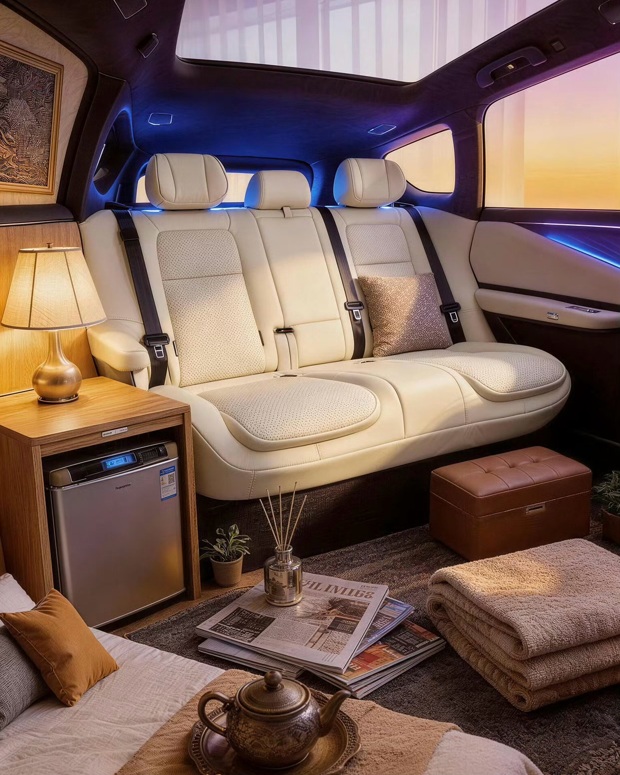 138mm头部空间,高个子坐后排也不憋屈。膝部能平铺三折叠手机,三人并排翘二郎腿都不挤。后备箱挺夸张,常规装13个行李箱,放倒能塞34个,露营装备随便堆。