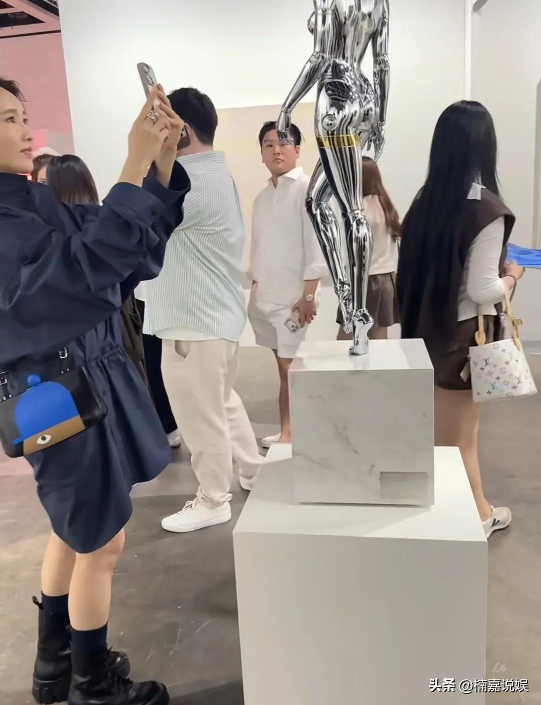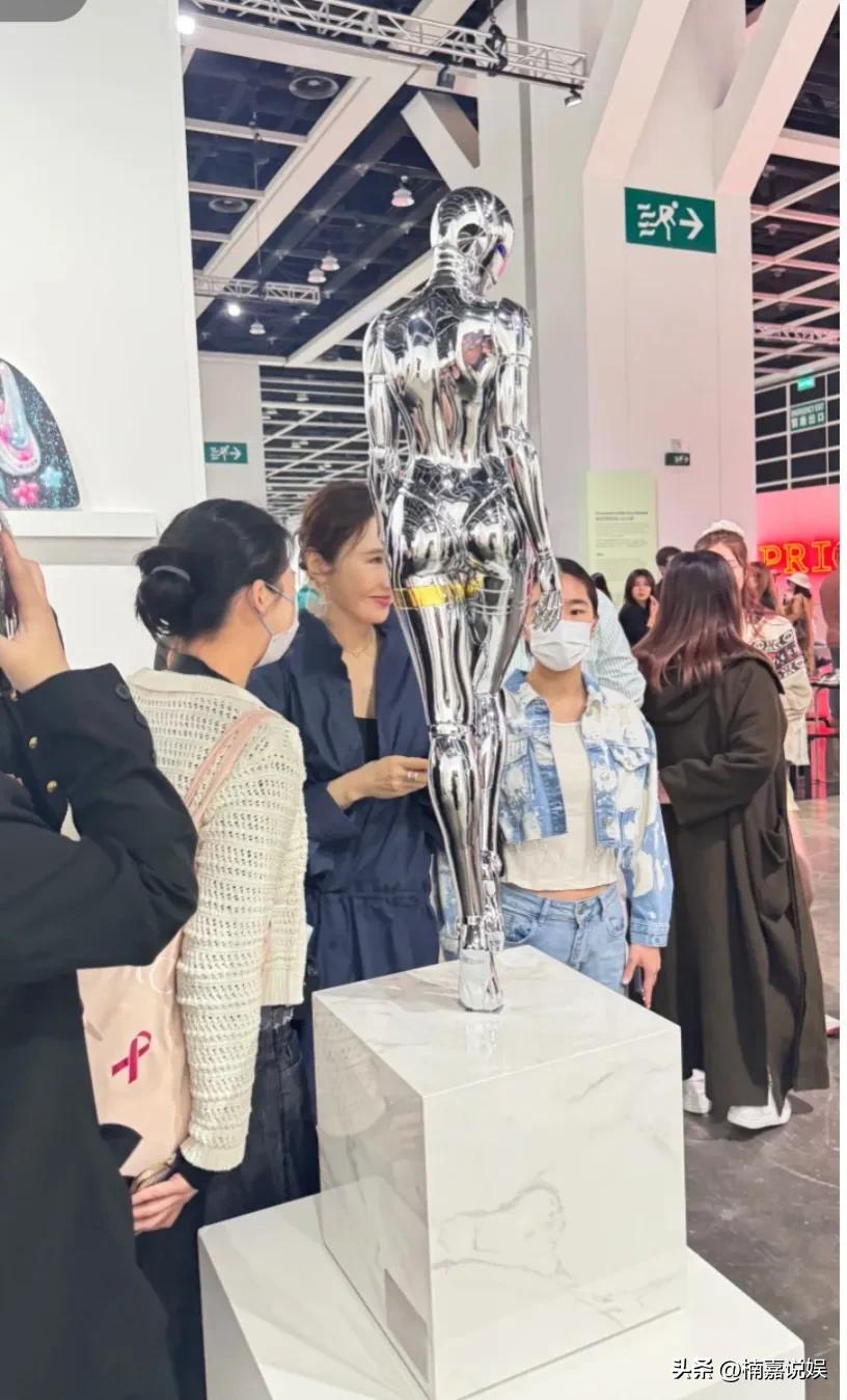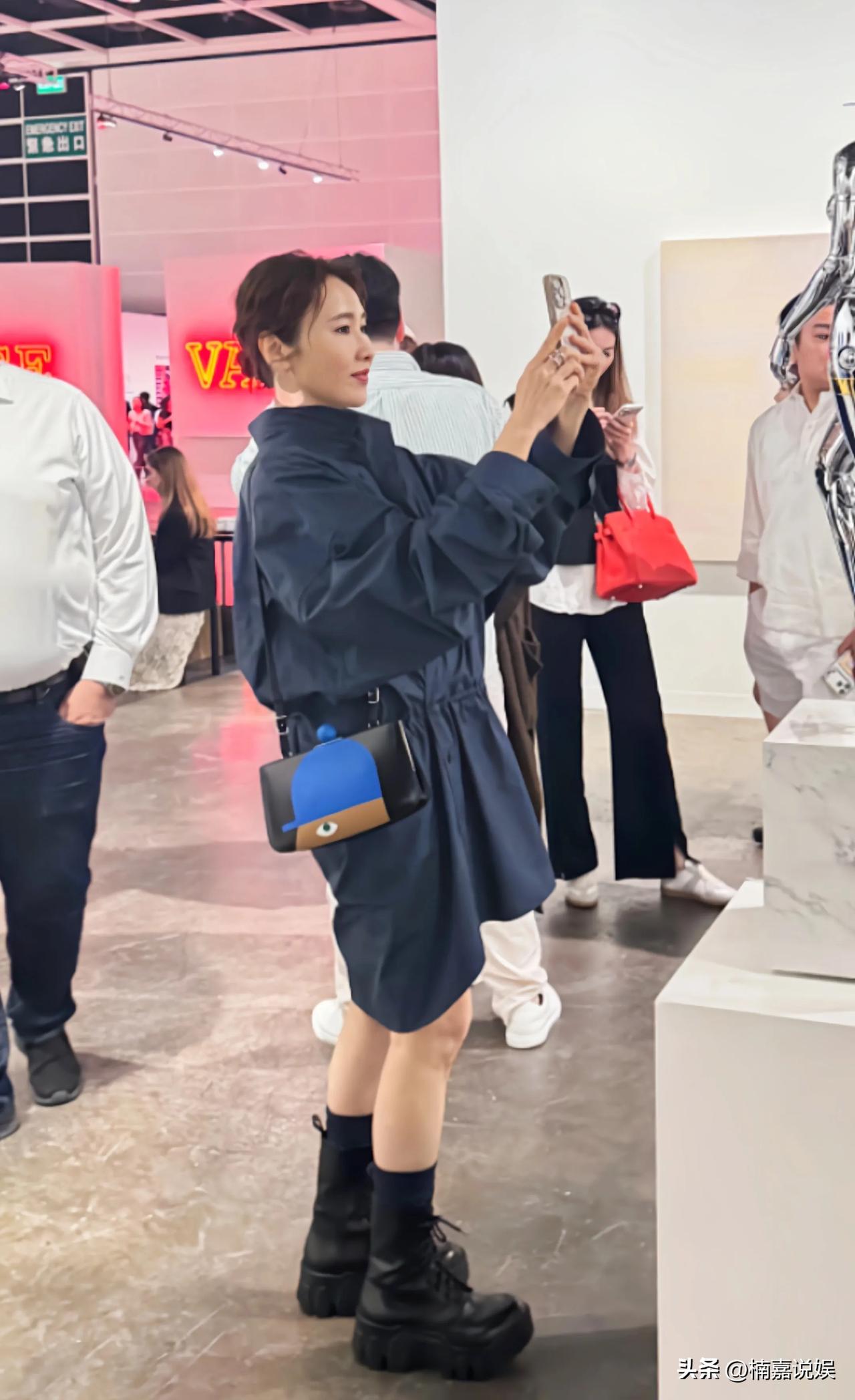 黎姿现身看艺术展,穿着一身深蓝色套裙,脚踩厚底靴子,扎着丸子头,本人看着好年轻,完全不显年纪。