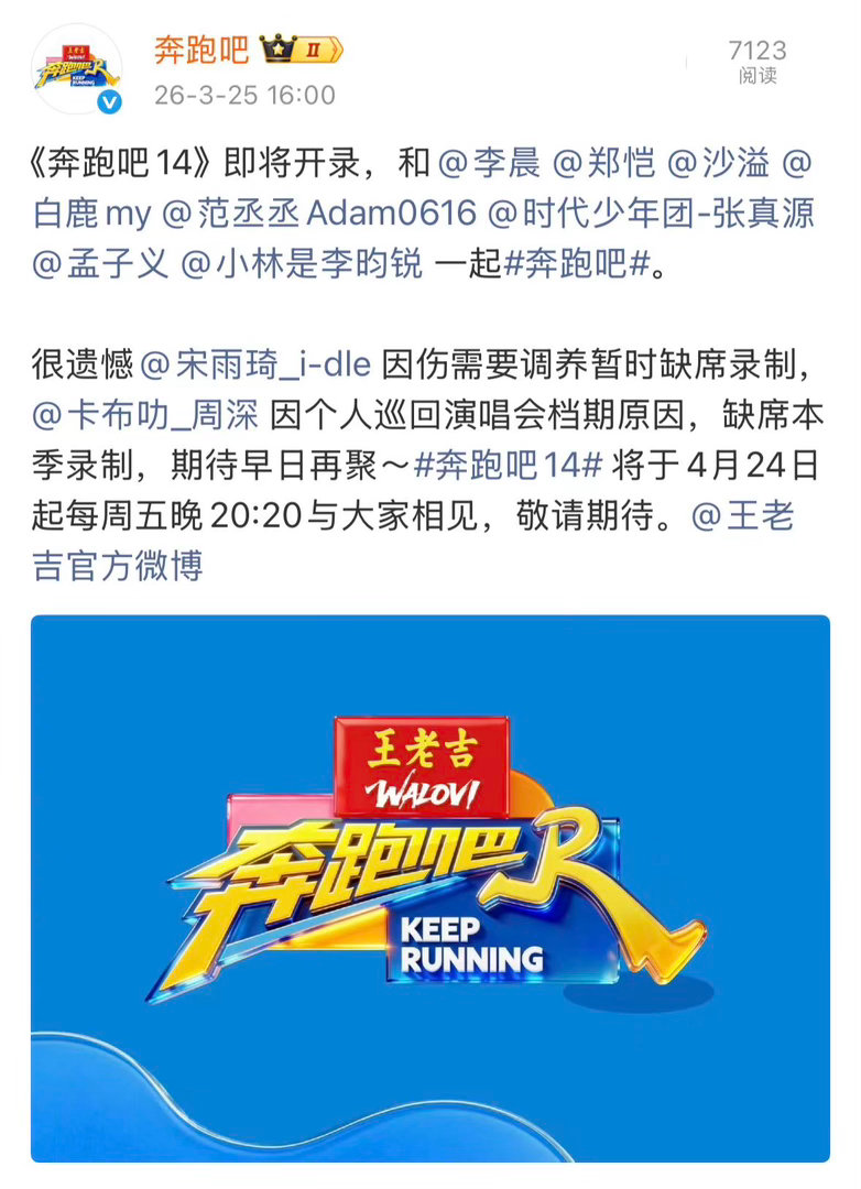 宋雨琦因伤暂时缺席录制跑男奔跑吧 看到消息有点心疼,雨琦好好养伤别着急!跑男4月24号开播,等你好了我们再一起跑!