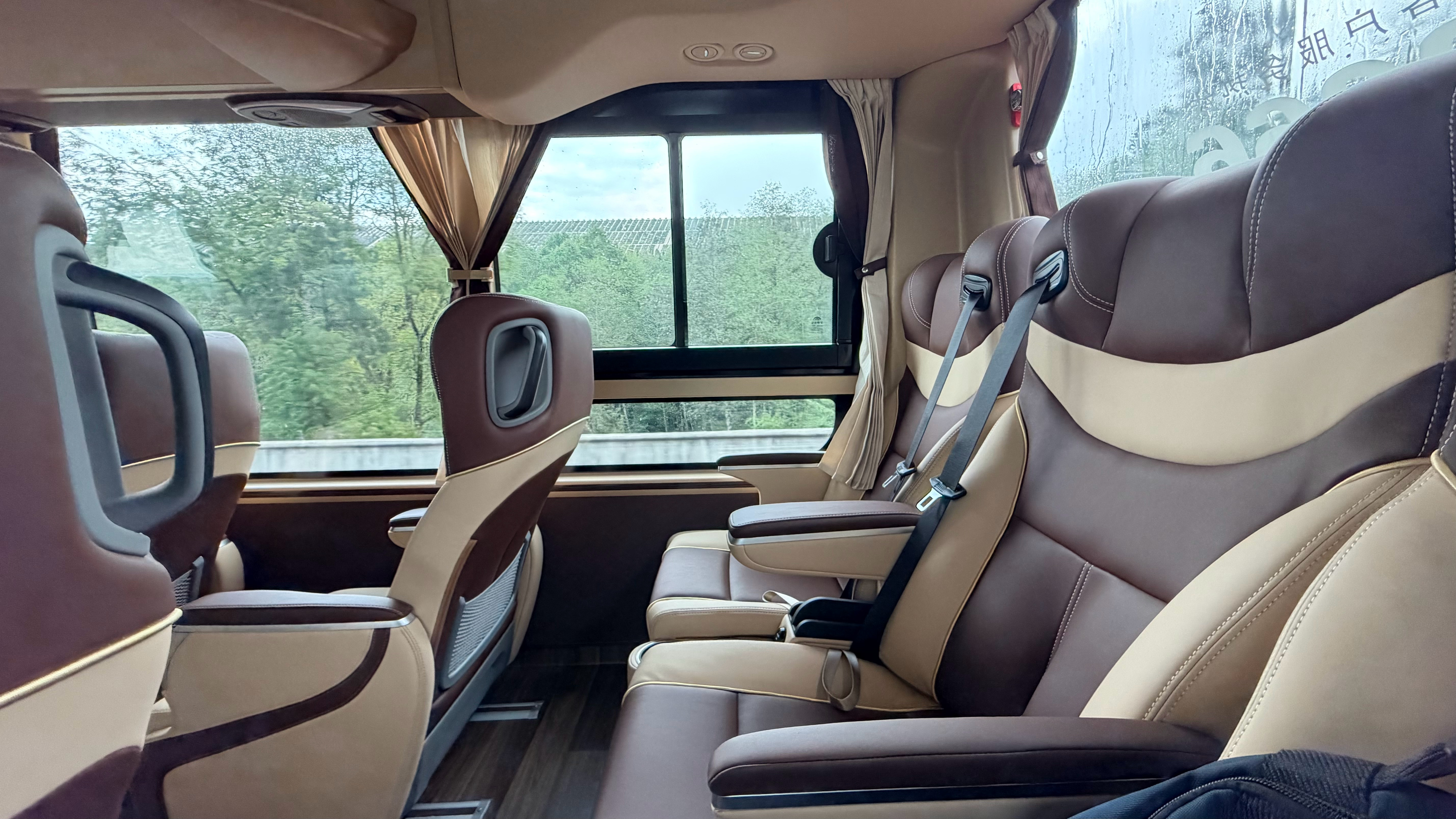 这个应该算商务BUS了吧,座椅非常得劲儿,哪怕是最后一排。建议所有大巴都卷起来,升级一下。感觉底盘过滤也很舒服,隔音也很好,和坐MPV没多大差别了。有懂的朋友说说,这样的大巴价格比普通的贵多少?