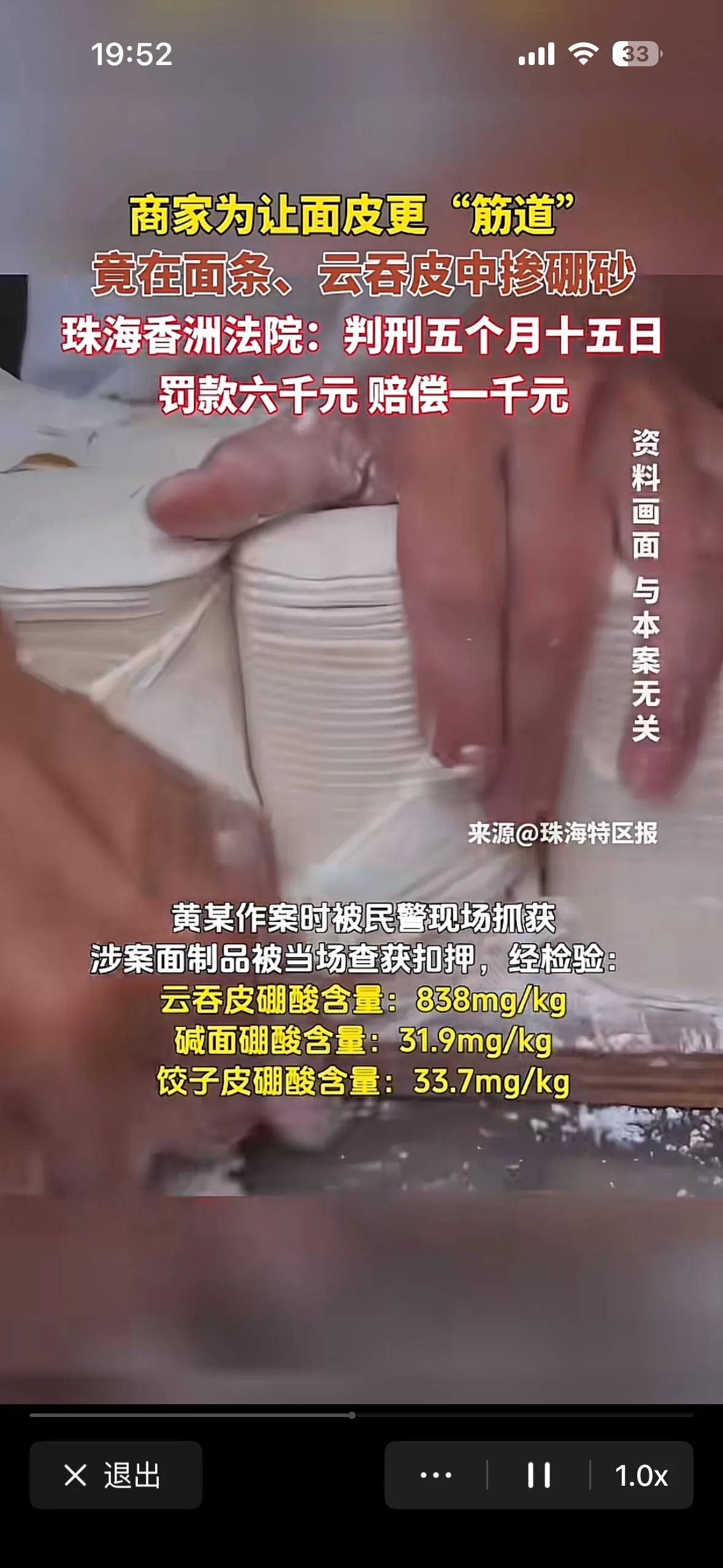 珠海一商家为了获利,在面条、饺子皮里掺入硼砂,这是食品安全明令禁止的。法院判决:罚款6000元赔偿1000元,判刑5个月15天。 这可是一级致癌物,难道不应该罚她个倾家荡产吗?几十年翻不了身才会长记性。 这是故意投毒,惩罚太轻了。半年后出来继续干这营生,管理部门能天天盯着吗?