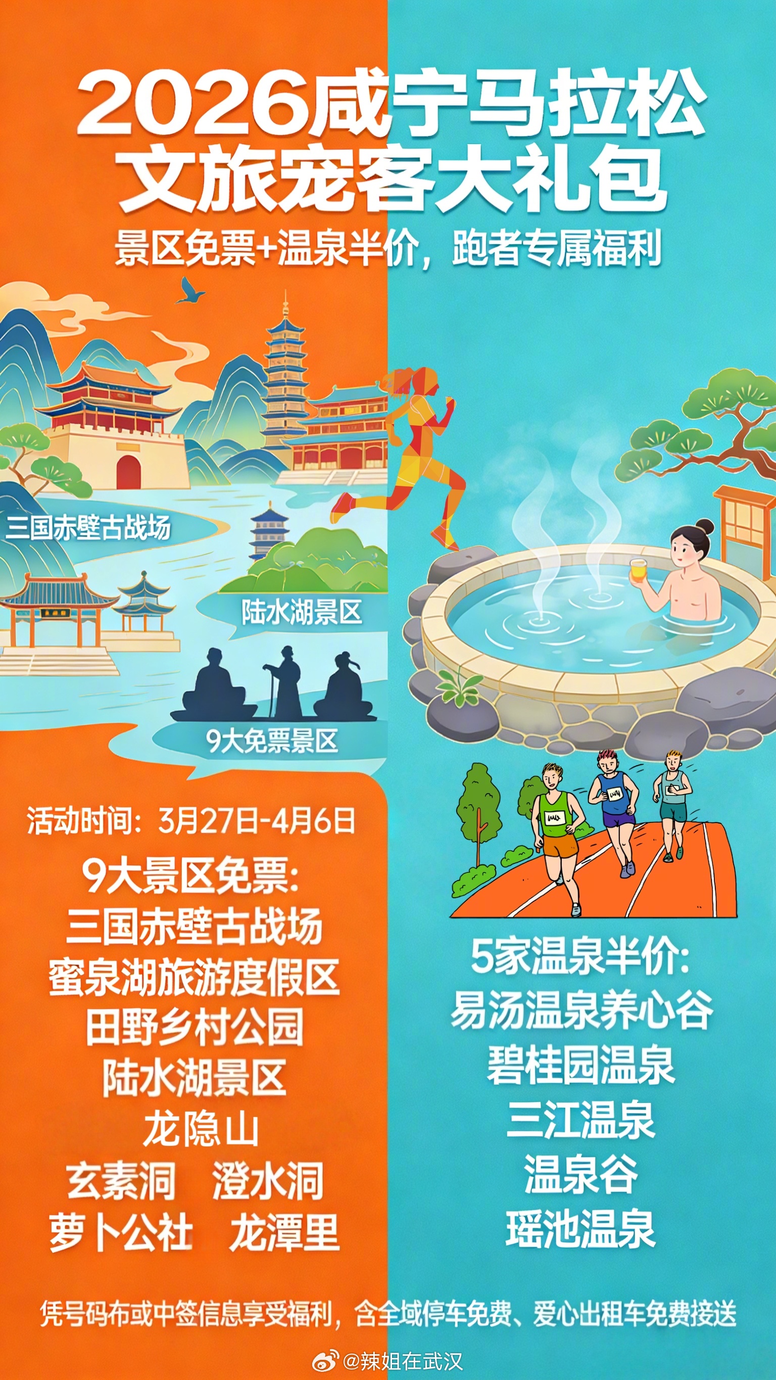 武汉2026咸宁马拉松 即将开跑!3月27日-4月6日,凭号码布或中签信息,即可畅享咸宁9大景区免票、5大温泉半价特惠!跑完马拉松,泡个暖汤解乏,更有全城免费停车与爱心出租接送。最惬意的“赛后恢复套餐”已备好,快来咸宁感受这座城市的满满诚意吧!✨ 武汉