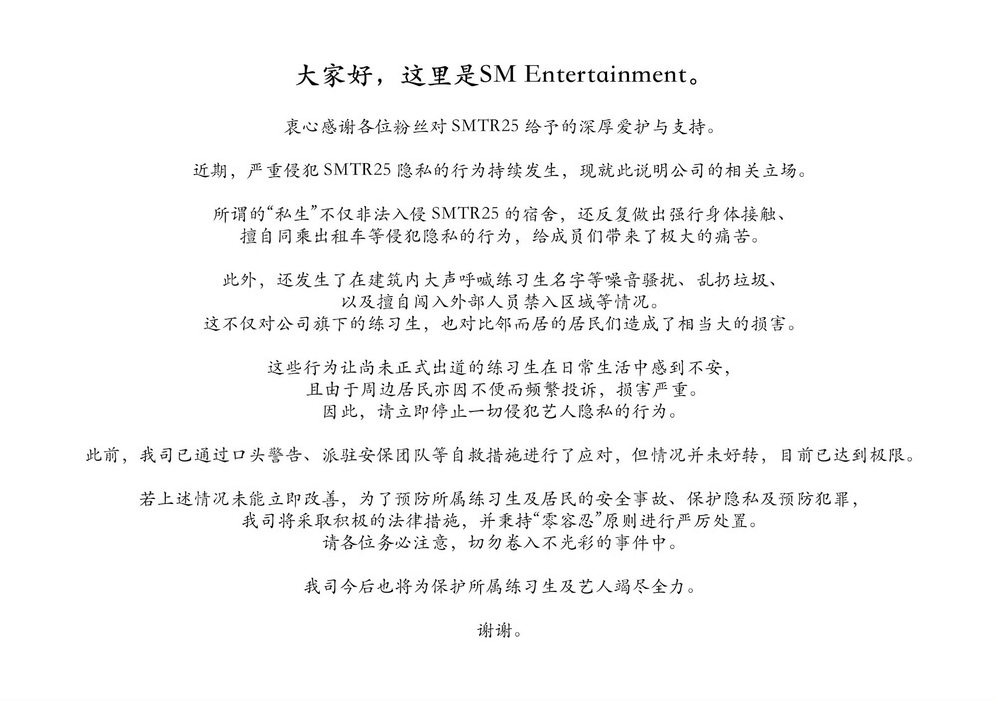 对于私生非法入侵宿舍、强行身体接触、噪音骚扰等侵犯SMTR25及练习生隐私的行为,表示将采取积极法律措施,秉持“零容忍”原则严厉处置,呼吁立即停止一切私生行为。