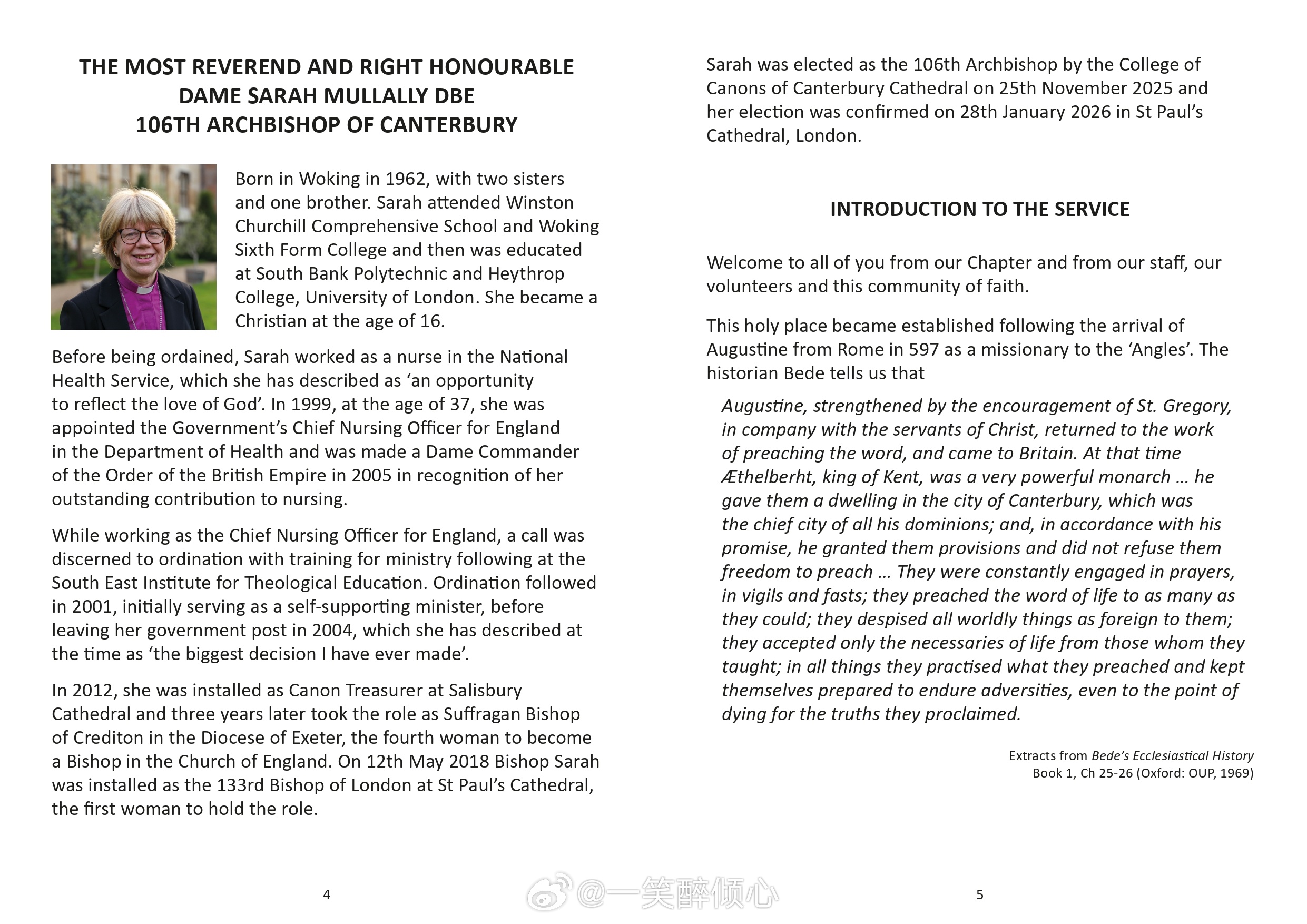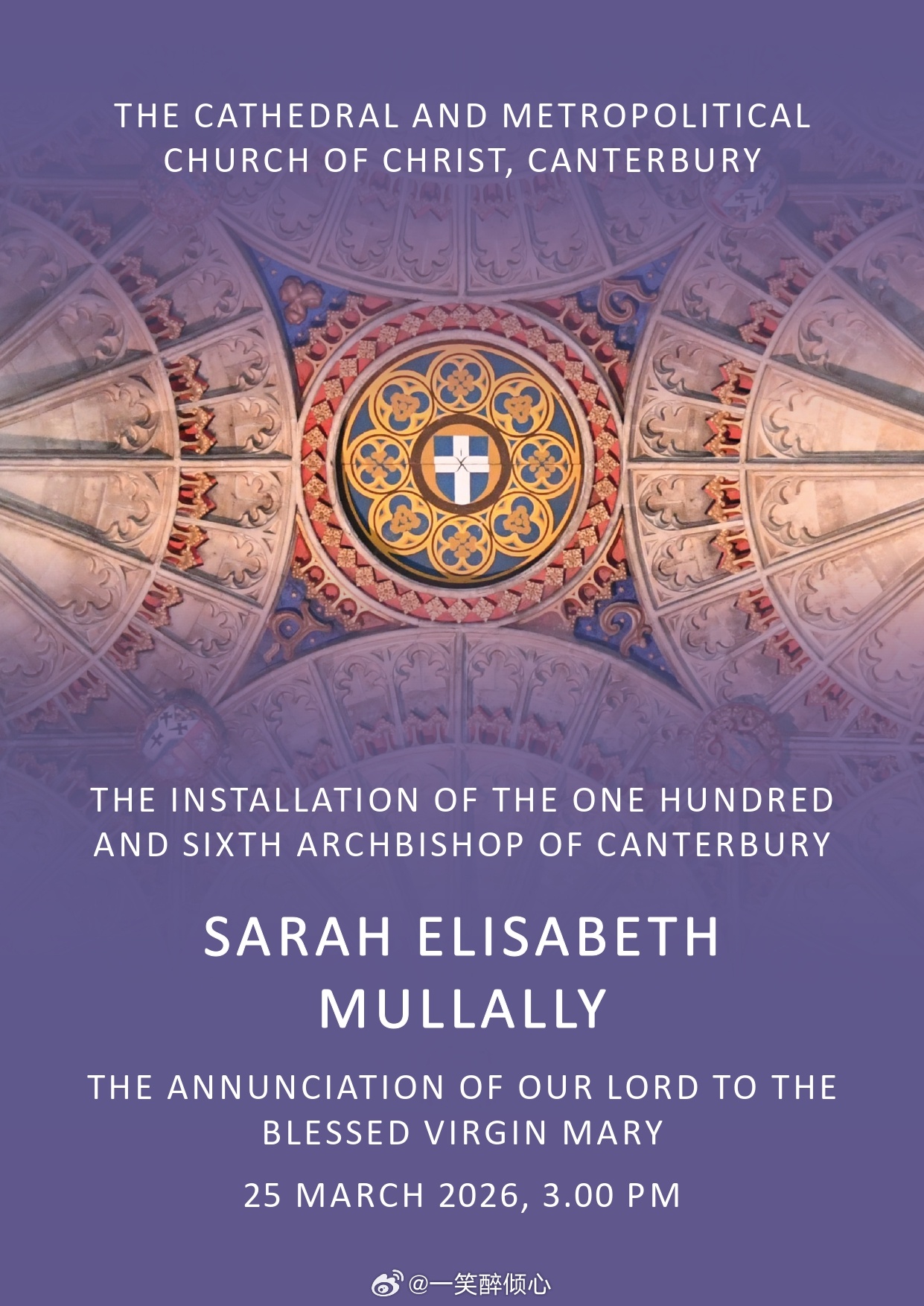 【摘录】当地时间今天下午三点Sarah Mullally女爵将会在坎特伯雷的坎特伯雷大教堂宣誓就任英国历史上第1️⃣0️⃣6️⃣任坎特伯雷大主教,因此她成为坎特伯雷1️⃣4️⃣0️⃣0️⃣年以来首位担任坎特伯雷大主教一职的女性。