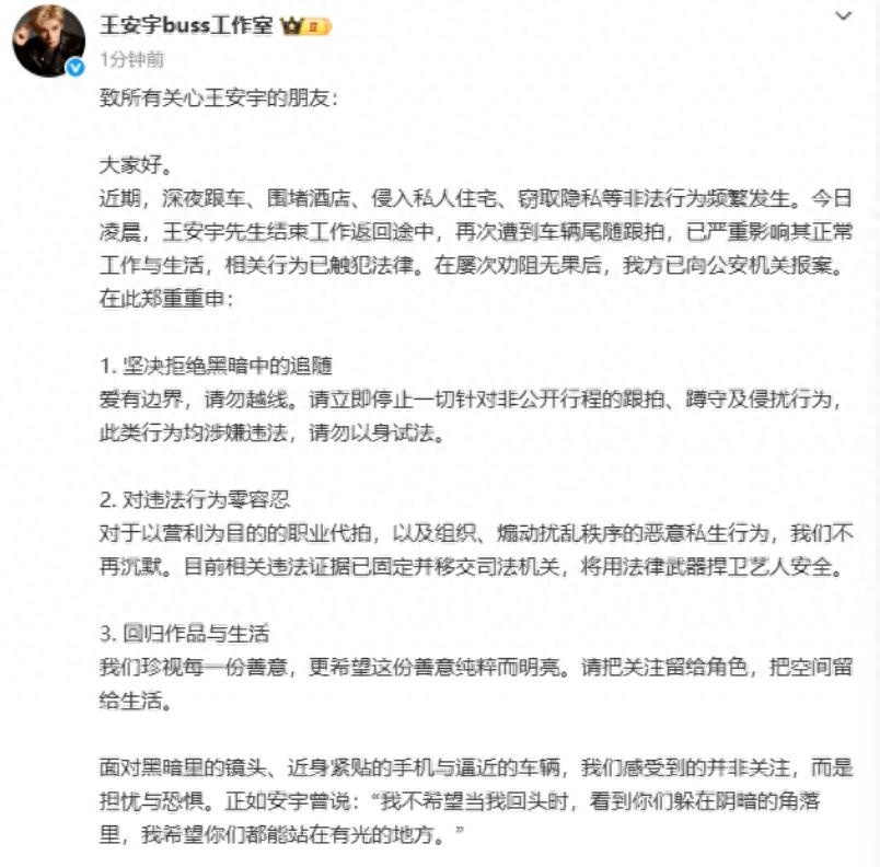 私生侵入王安宇私人住宅 私生不仅深夜跟车围堵,更胆大包天侵入住宅窃隐私,触碰法律红线。王安宇工作室果断报案维权,零容忍态度获全网力挺,追星绝不能无底线。