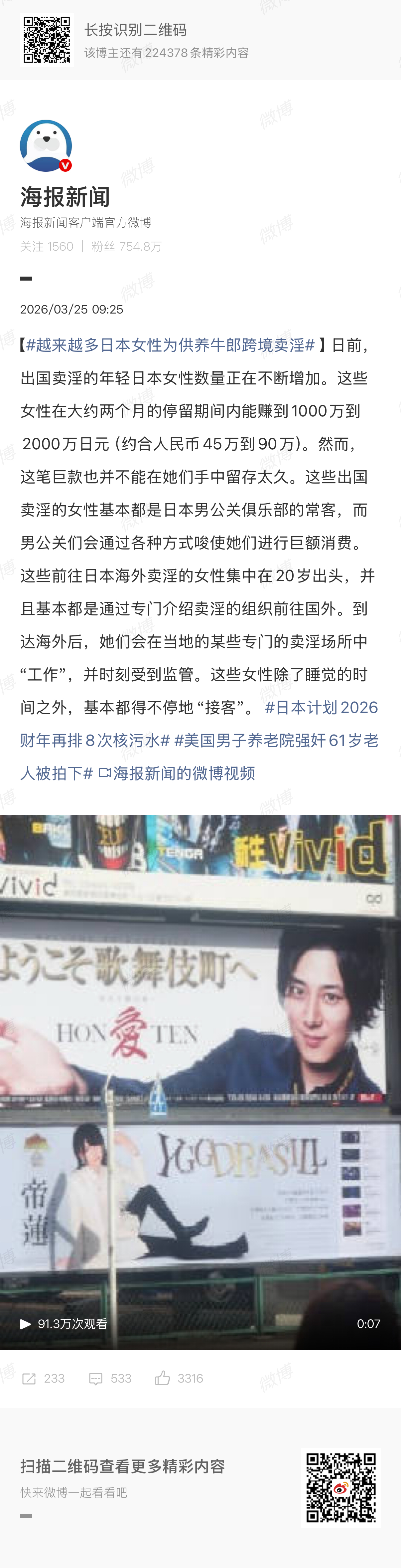 🔻日本文化不就是这样的?一百多年前南洋姐的时代就开始了。🔻从“南洋姐”到招核孩子,从婚姓到男女不同工同酬,日本女性面临的系统性、结构性压迫,自然而然地形成了巢窟,这是一个在女人尸骨和血泊中膨胀的吃人巨兽,被物化而不自知,习惯性的在沉船时优先牺牲女性罢了。🔻对于这样的日本社会,不破除剥削的阶级结构,“女权”运动又有什么意义呢?越来越多日本女性为供养牛郎跨境卖淫海外新鲜事热点现场