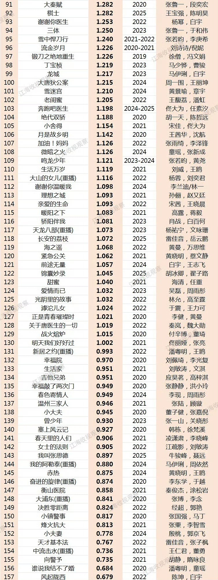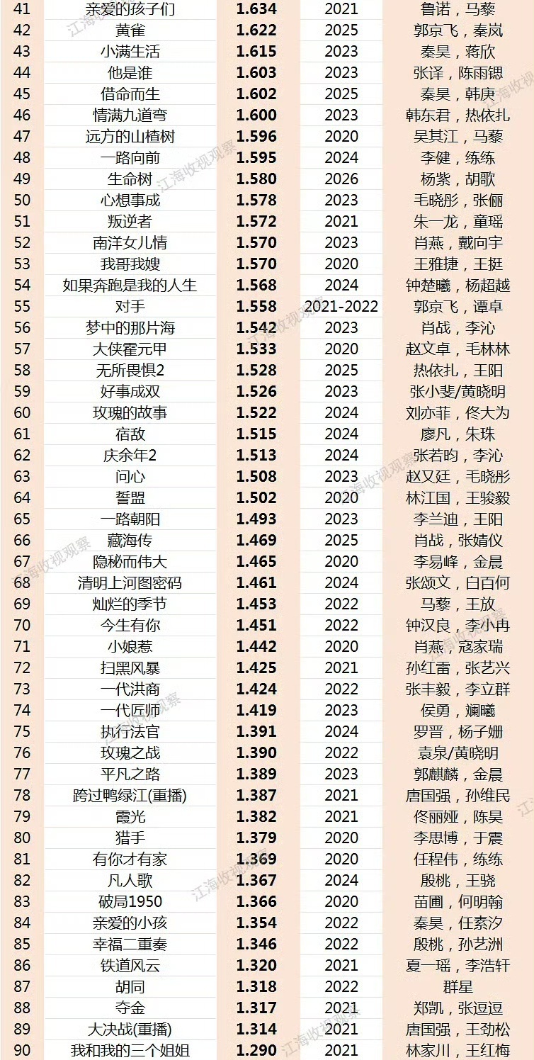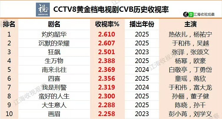 央八黄金档电视剧历史收视率央八黄金档电视剧CVB历史收视率榜单涵盖多部国民级作品,《灼灼韶华》《狂飙》《沉默的荣耀》等剧集凭借优质内容创下收视佳绩,不同年代的高收视作品反映出观众审美与市场偏好的变化,你看过哪部剧