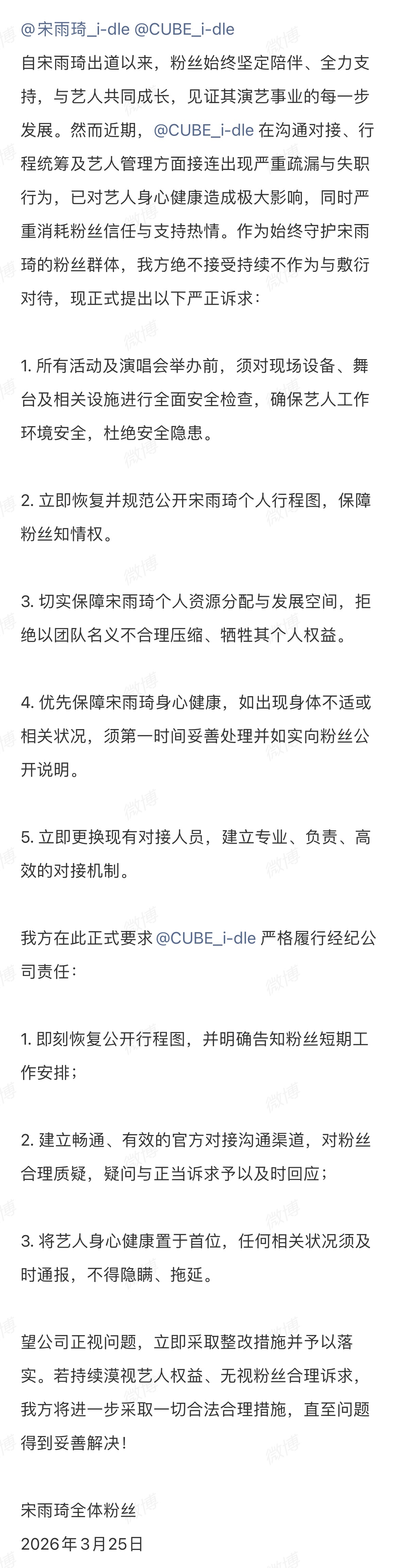 宋雨琦粉丝发长文对cube诉求实时更进宋雨琦身体健康问题,恢复行程图,及合理安排团体行程及个人行程,拒绝以团队名义压缩个人权益。请cube正视宋雨琦粉丝诉求