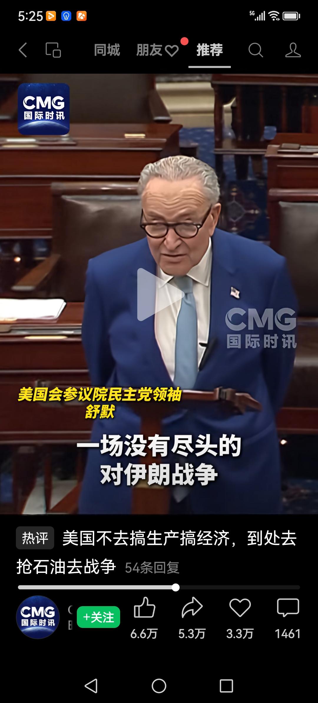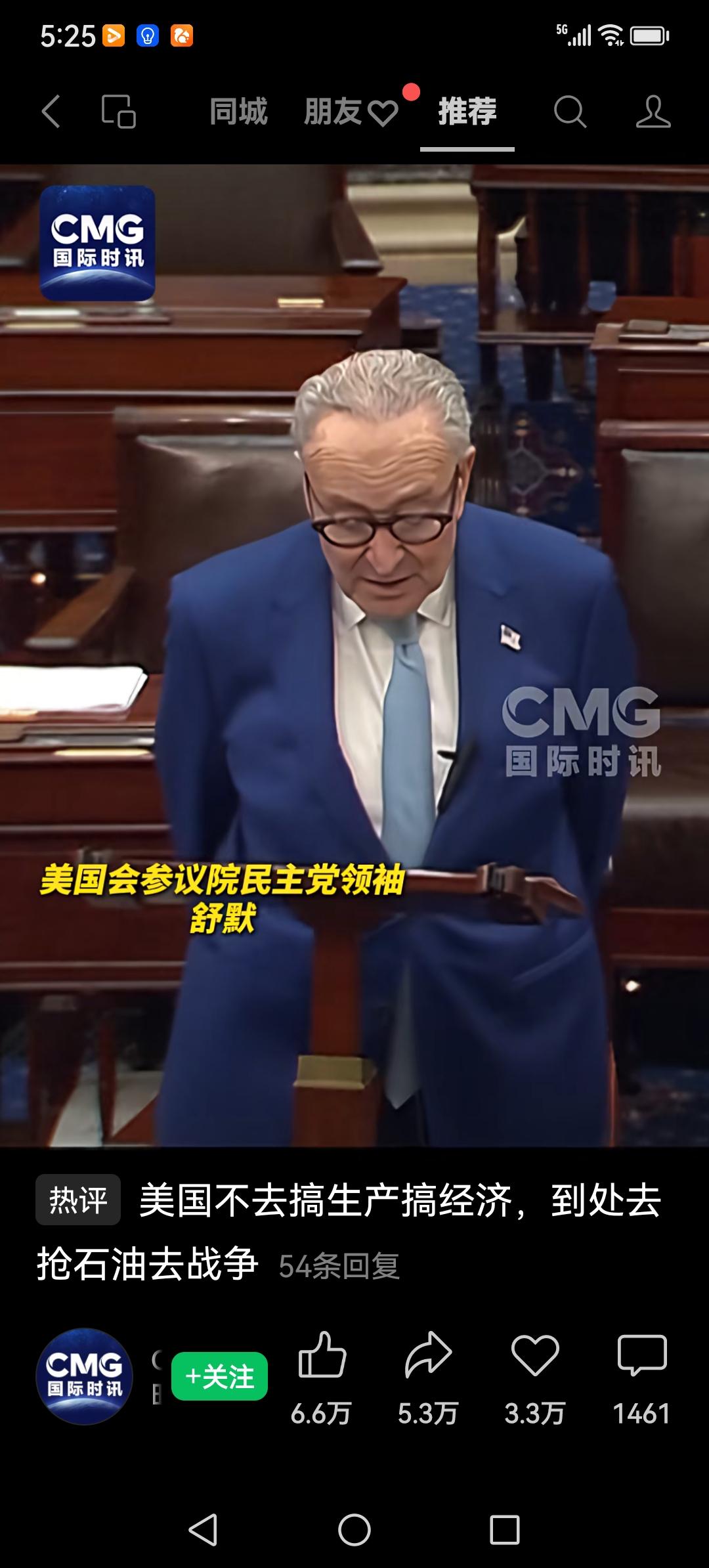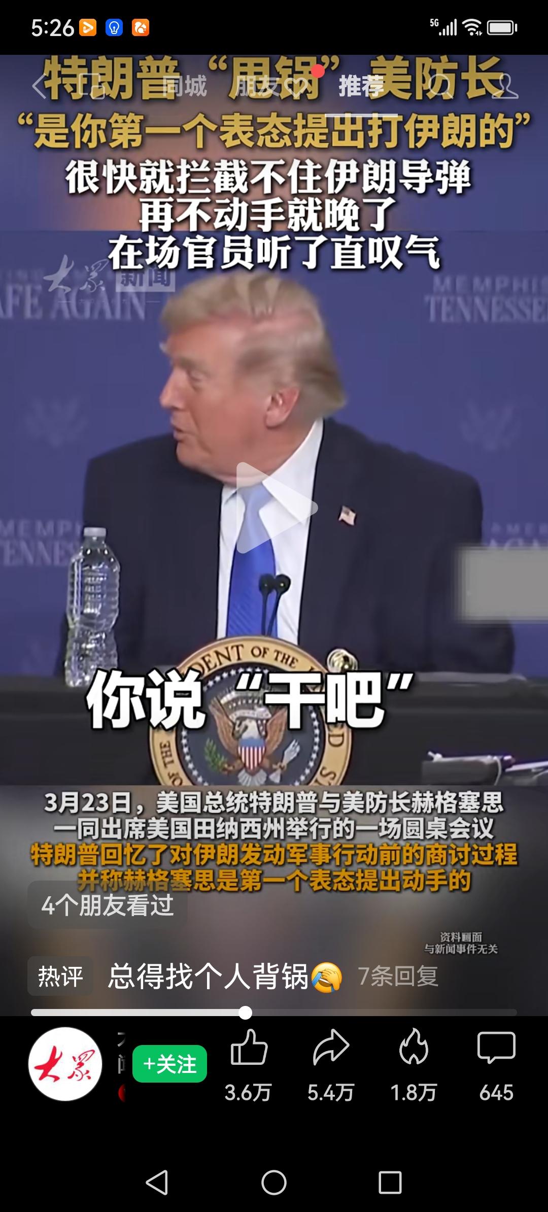 3月23日:特朗普与美国国防部长赫格塞思出席在田纳西洲举行圆桌会上,特朗普将美以与伊朗的战争的锅甩给国防部长,特朗普说,记得在动手前我给凯恩将军与许多优秀的人打电话,他们都说在同伊朗谈一谈,等等再说。但我记得是你说,“干吧”在对伊朗动手前是赫格塞思第一个说动手吧!再不动手,以后我们就拦截不住的伊朗的导弹了。 现在特朗普的压力大了,美国会参议院领袖舒默,在国会上发言说,要尽快结束同伊朗的战争,美国的经济压力太大了,物价上涨,更进一步的说,明天早上的面包都知道买得买不到?物价飞涨,确实让美国民众的情绪已经忍无可忍了,反对特朗普的声音越来越大了,再加上美国下半年两党中期选举,对特朗普的后任期不利。所以说特朗普把锅甩给国防部长赫格塞思,想摆脱对特朗普不利的局面,现在美以同伊朗的战争还高悬不下,如果特朗普罢手不战了,对美国而言已往的战无不胜的美军是一次耻辱的战绩。但不论战争下一步如何结束,美国的霸王位子是一落千丈。