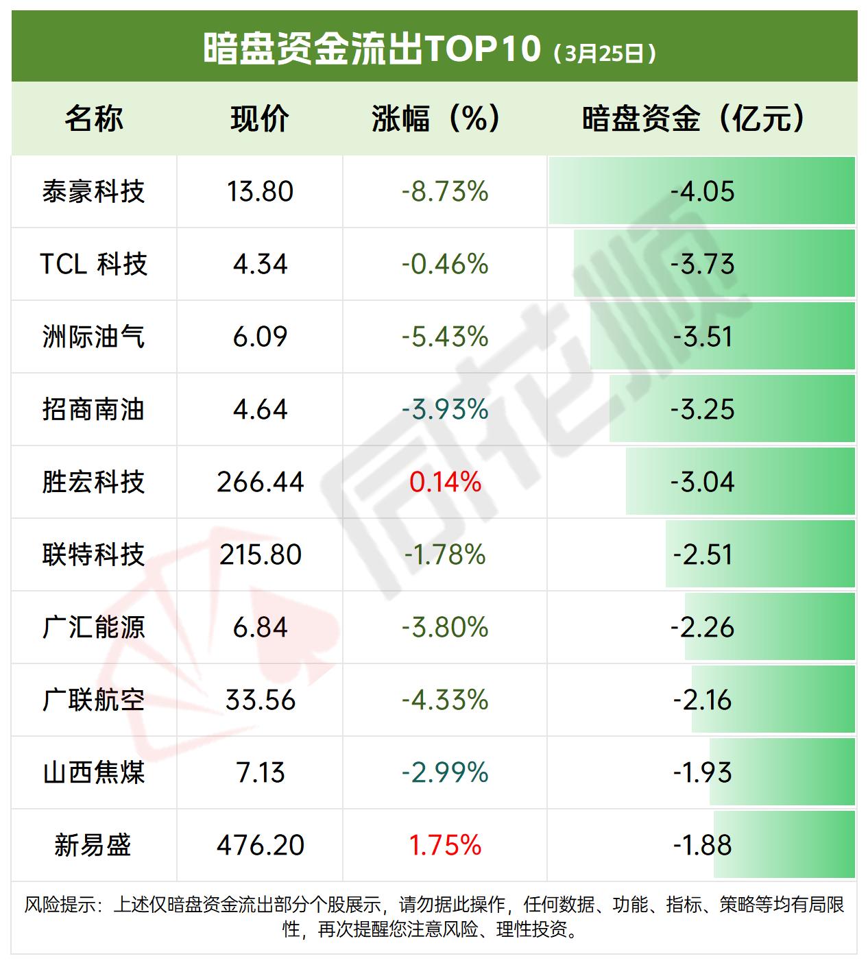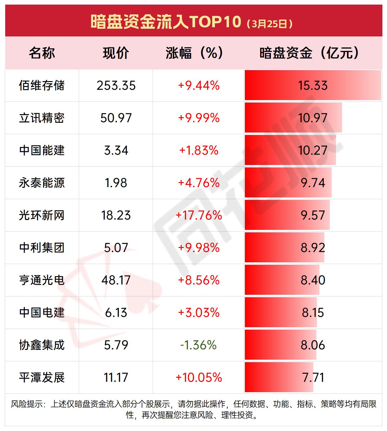 3月25日沪深市场暗盘资金流向解析📊 3月25日沪深市场暗盘资金净流入1751.53亿元,较昨日增加182.03亿元,市场情绪偏积极。暗盘流入个股达4473家,较昨日增加18家,流出个股535家,较昨日减少16家,资金做多意愿显著增强。 从流入榜看,科技与能源板块表现突出:佰维存储、立讯精密等科技股获大额资金追捧,分别流入15.33亿、10.97亿元;中国能建、永泰能源等能源基建股也位列前十,显示资金对高景气赛道的偏好。 流出榜方面,泰豪科技、TCL科技等个股资金净流出居前,部分个股股价同步下跌,资金避险情绪集中在部分高位或基本面偏弱标的。整体来看,暗盘资金呈现“科技+能源”主线流入、弱势标的出逃的分化格局,需警惕短期波动风险。!!!