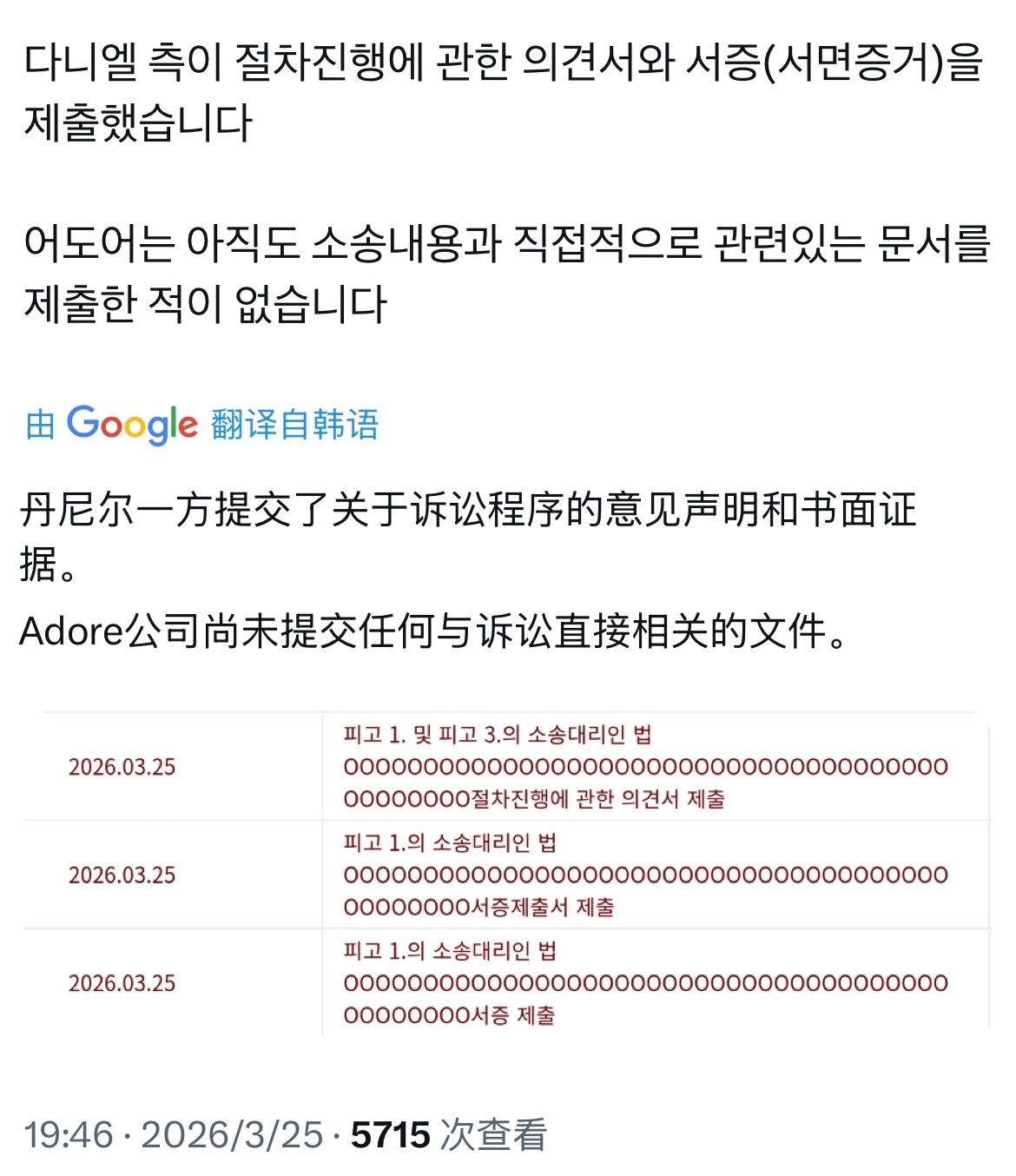 Danielle一方提交了关于诉讼程序的意见声明和书面证据。Adore公司尚未提
