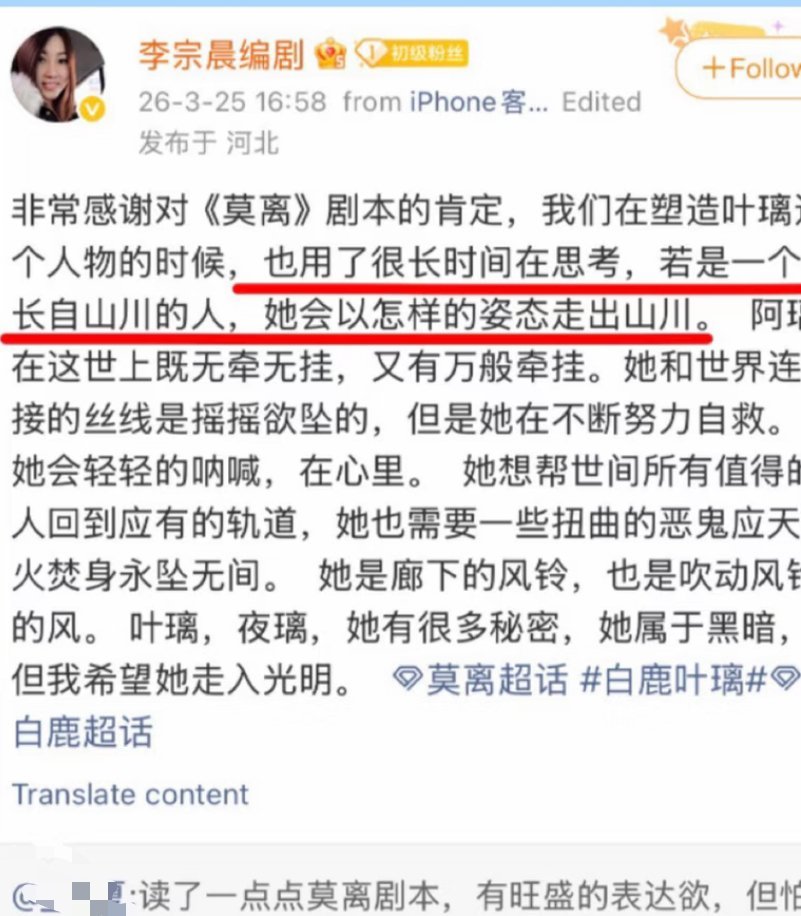 白鹿主演莫离的编剧,回复关于莫离剧本的观后感。其实我读完莫离,叶璃给我的感觉是一杯烈酒,没有白水那么温柔,没有红酒那么火热,却烈到刺骨,痛到钻心。她以优雅的姿态,与世界交手。心有猛虎,细嗅蔷薇,行有雷霆,面若春风。