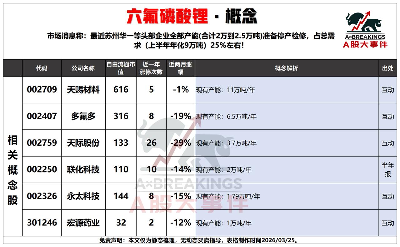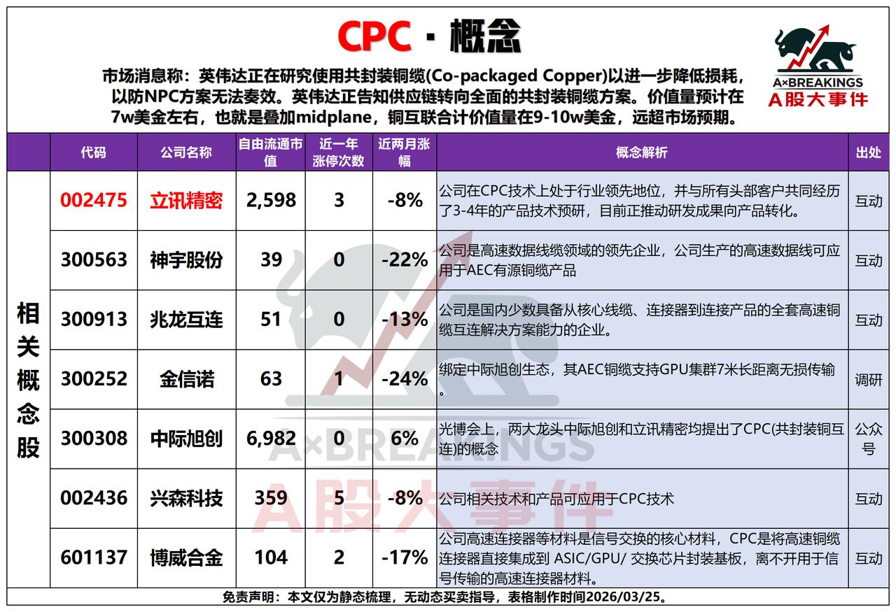 3月25日三大热点概念解析📊 3月25日,PA66、六氟磷酸锂、CPC三大概念受事件催化,呈现不同的资金逻辑。 PA66:英威达宣布4月1日提价33%,价格快速迈入“2万时代”,行业供需偏紧。神马股份作为国内PA66龙头,产能32万吨;华峰化学、中国化学等企业也在扩产或突破原料垄断,涨价逻辑直接利好全产业链标的。 六氟磷酸锂:苏州华一等头部企业计划停产检修,涉及产能占总需求25%,供给收缩预期升温。天赐材料、多氟多等企业产能充足,短期供需错配或推动价格反弹,相关标的具备弹性。 CPC:英伟达转向共封装铜缆方案,价值量超市场预期。立讯精密、中际旭创等龙头在技术上领先,神宇股份、兆龙互连等企业在高速线缆领域具备配套能力,AI算力升级驱动下,CPC产业链成长空间打开。 整体来看,三大概念均由供给端事件或技术迭代催化,PA66与六氟磷酸锂偏短期涨价逻辑,CPC则具备中长期AI算力成长逻辑!!!