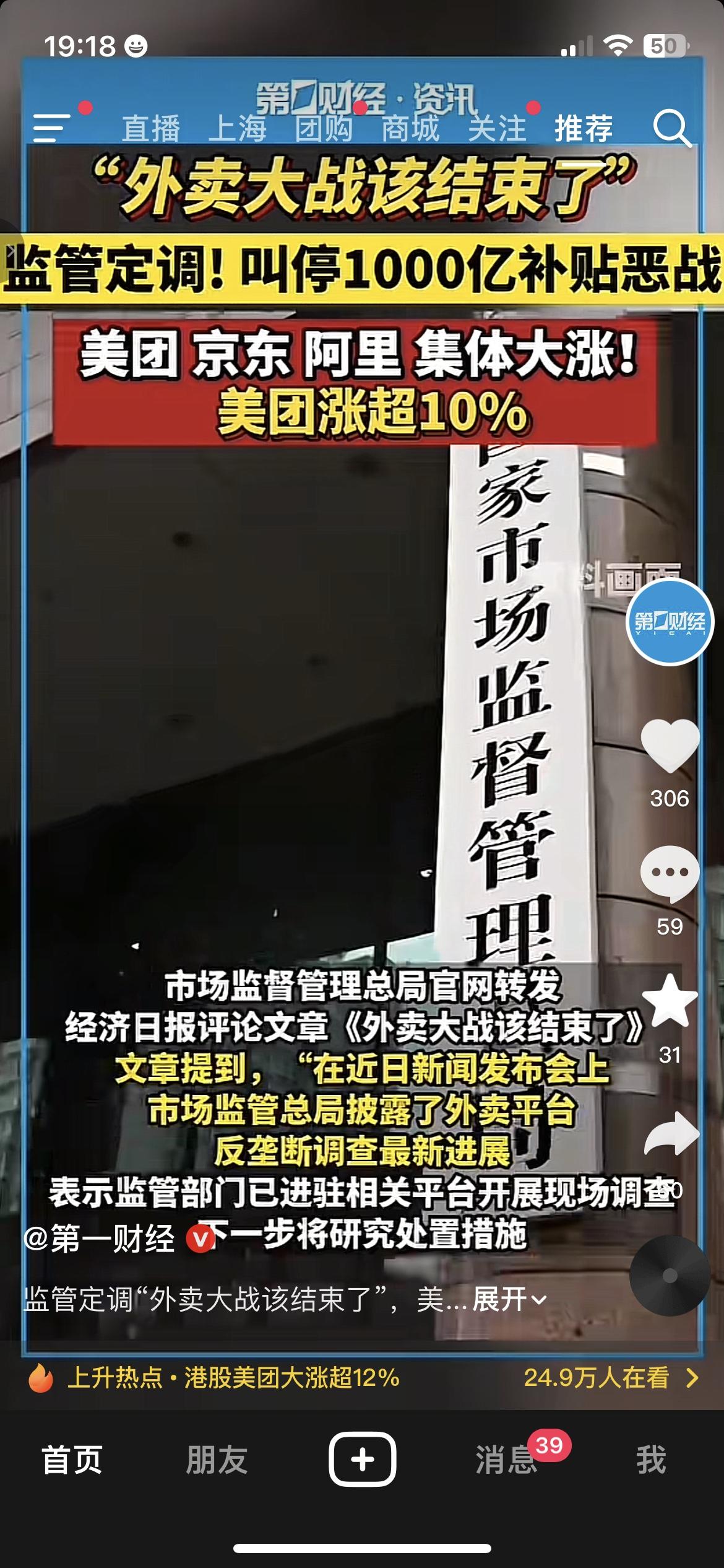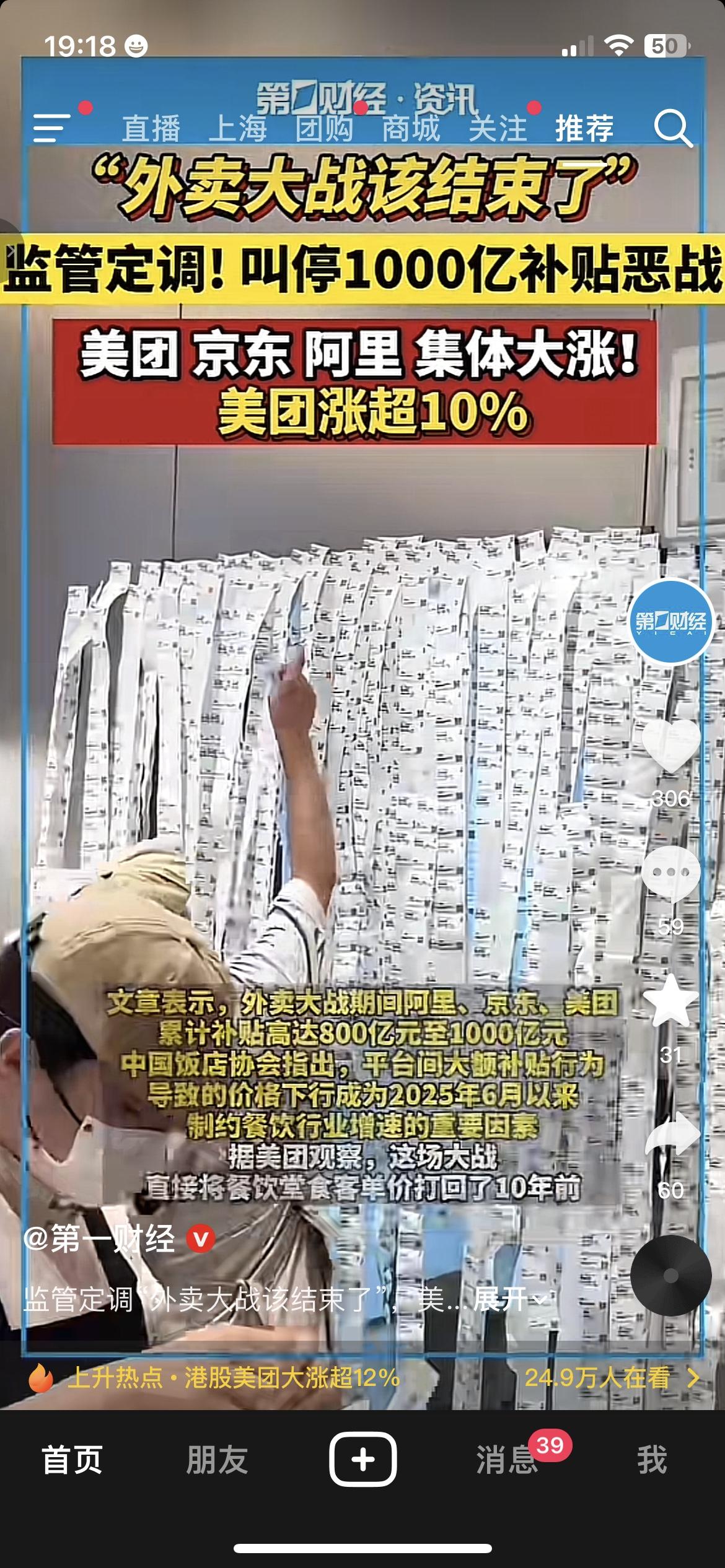 烧了1000亿的外卖补贴被叫停!美团涨超10%,谁才是真正赢家? 家人们,天天点的外卖,要变天了!🔥 经济日报直接点名“外卖大战该结束了”,市场监管总局火速转发,这场砸了800-1000亿的补贴恶战,终于要被叫停了! 你细品,之前的“满30减20”“0元起送”,看似薅到羊毛,实则是平台烧钱堆出来的泡沫。中国饭店协会早就说过,这种大额补贴让餐饮客单价打回10年前,老板偷工减料、骑手收入被压,我们吃的都是“注水饭”,食品安全全没保障。 现在监管定调了:健康竞争靠技术、效率和服务,不是烧钱搞零和博弈。消息一出,美团、京东、阿里集体大涨,美团港股直接涨超10%! 说白了,以后不会再有离谱低价,但餐饮能活下来,我们才能吃到靠谱的饭,长远是好事。 你觉得外卖价格会涨吗?评论区聊聊! 外卖大战 餐饮行业 消费补贴 美团股价