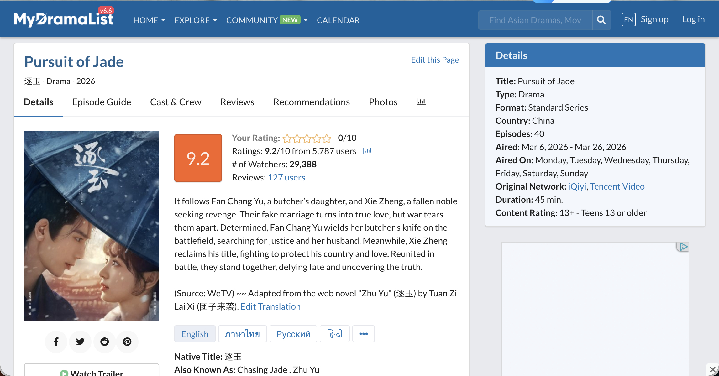 逐玉MDL评分第二高亚洲剧 《逐玉》真的太争气了!🔥继刷新Netflix纪录后,又以 9.2 高分登顶 MyDramaList,成为目前评分第二高的亚洲剧!MDL堪称海外版豆瓣,是海外主流权威评分平台,评分人数也很多,在外网已是极高热度。剧集火到两岸刷屏获官方认可,以剧为桥传播中华文化,开年爆款名副其实,🐧站内热度突破31000,成绩六边形战士,真是给国产剧长脸了!