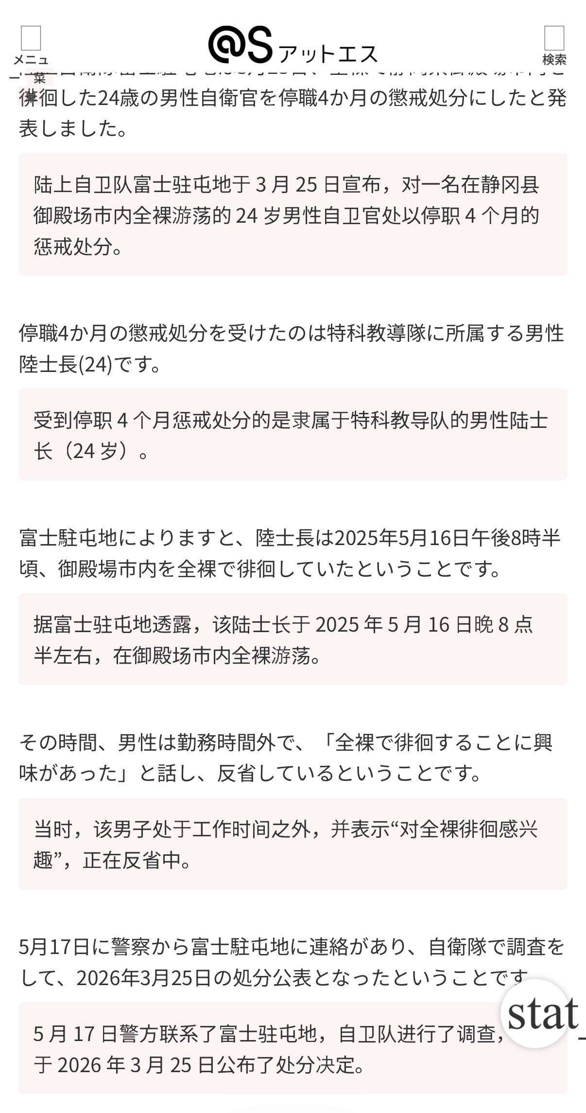 🔻日本陆上自卫队富士驻屯地于 3 月 25 日宣布,对一名在静冈县御殿场市内全裸游荡的 24 岁男性自卫官处以停职 4 个月的惩戒处分。🔻日本自卫队这些废物现在连干坏事的能力都欠奉。🔻via at-s 新闻海外新鲜事热点现场