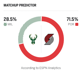 ESPN预测明日比赛:雄鹿胜率28.5%,开拓者胜率71.5%