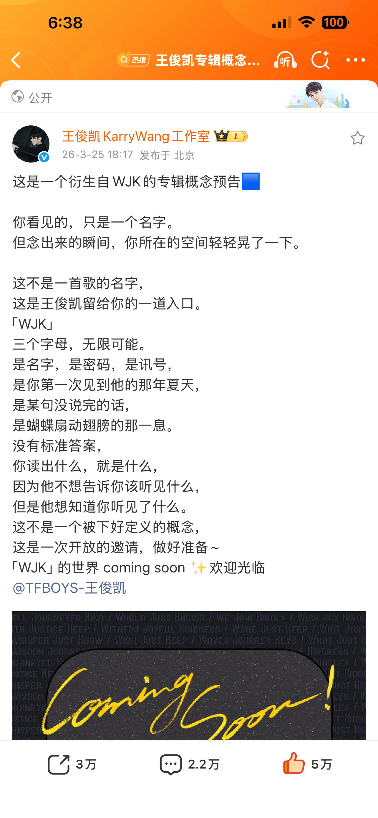 王俊凯新专辑预热《WJK》工作室发文明天有惊喜