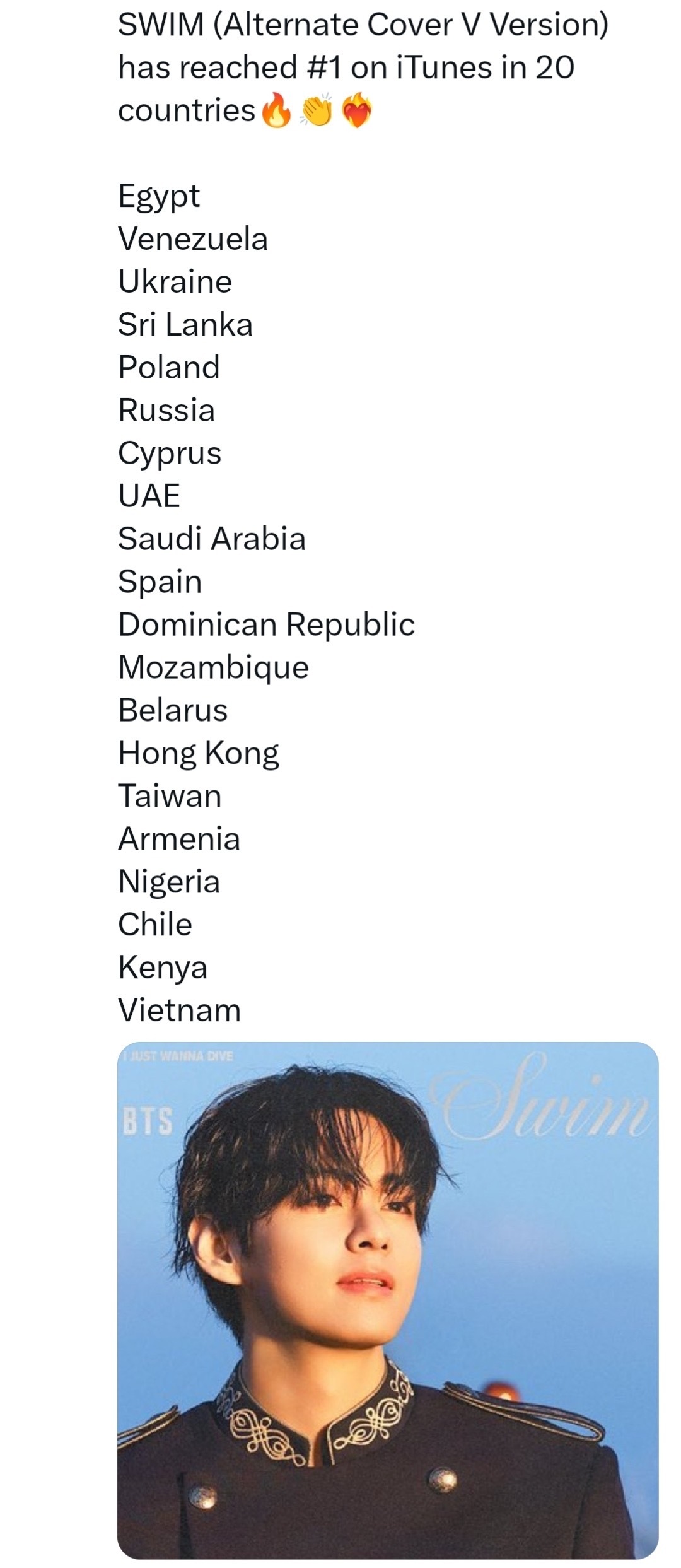 金泰亨SWIM (Alternate Cover V Version) 已在20个国家及地区的iTunes榜单登上一位BTS内【首个&唯一】达成20个一位成员领跑BTS成员单封最多地区登顶数📈