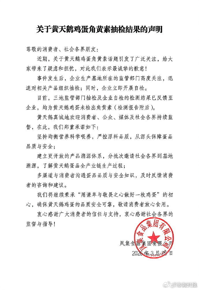 【#打假团队质疑黄天鹅鸡蛋检测#】3月25日下午,黄天鹅发布《关于黄天鹅鸡蛋角黄素抽检结果的声明》,宣布企业生产基地所在地三地监管部门的抽检及企业自检结果已反馈,均为“未检出角黄素”。