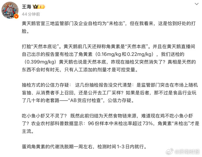 然而,“未检出”的结论并未能平息质疑。同日,职业打假人王海及其测评实验室发布长文,从采样程序、代谢周期、检测定量限及机构资质等技术层面逐一提出异议。王海测评实验室认为,消费者委托出具的检测报告均具备CMA(检验检测机构资质认定)资质,具有事实证明效力;而黄天鹅此前公布的部分抽检报告中,个别地方市场监管局的报告并未显示取得CMA资质。