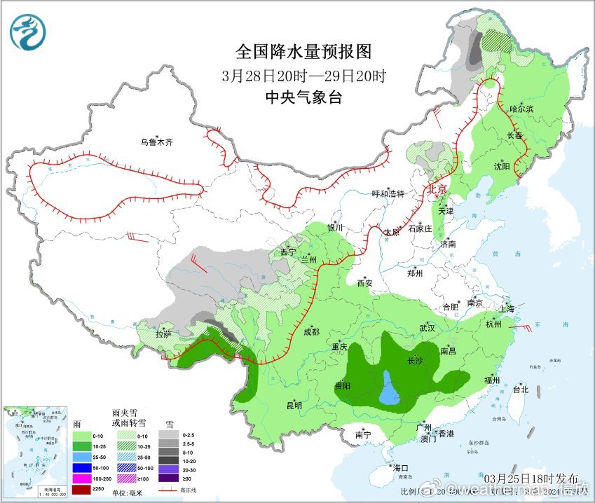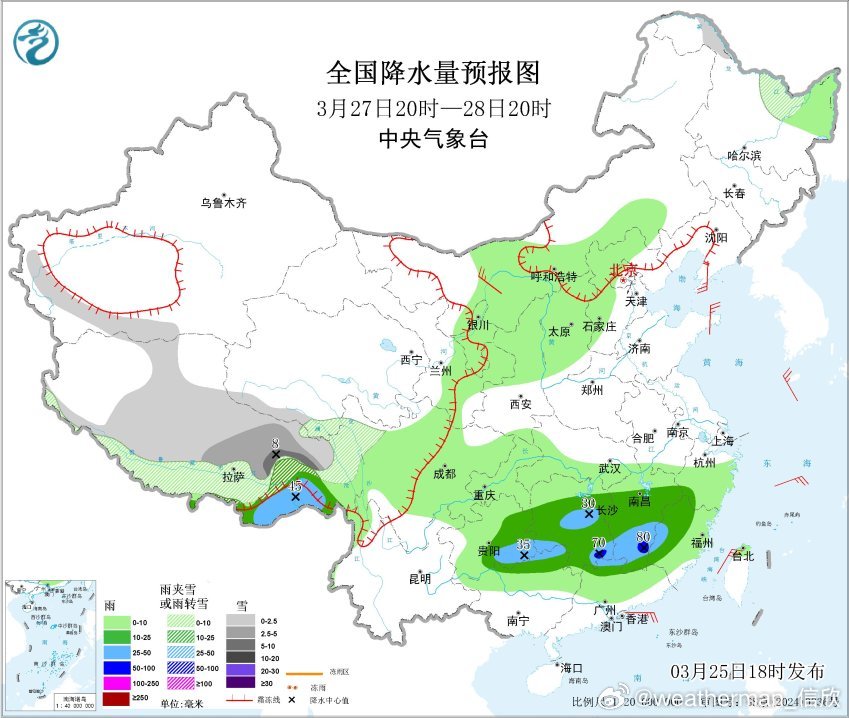 3月27日20时至28日20时,冷涡/高空槽继续东移,黑龙江北部和西藏大部等地部分地区有小到中雪或雨夹雪,其中,西藏东部等地部分地区有大雪(5~8毫米);暖湿气流再次加强,西藏东南部、贵州东南部、广西北部、湖南中部和南部、江西南部、福建西部等地部分地区有大到暴雨(50~80毫米)。