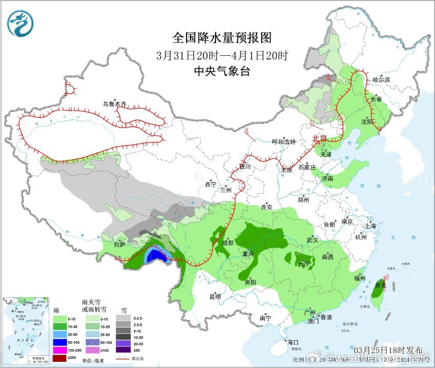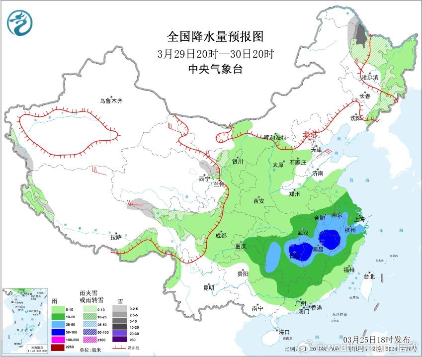 29日晚-30日南方的低空急流达到近期最强,降雨还会进一步发展增强,江南地区将出现成片的大到暴雨。与此同时,北方的冷涡移动到东北,继续导致雨雪。而且冷涡后侧,还有高空槽东移,3月31日-4月1日,华北东北等地还有降水过程,内蒙古、山西北部等地可能有雪或雨夹雪。