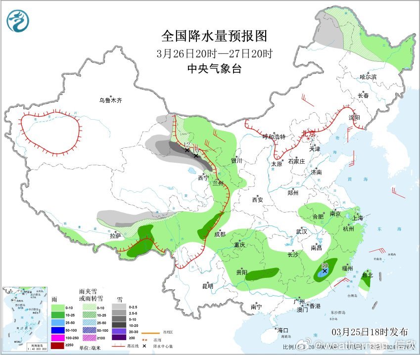 3月26日20时至27日20时,冷涡缓慢东移,内蒙古东北部、黑龙江西北部、西藏东部、青海北部、甘肃河西等地部分地区有小到中雪或雨夹雪,其中,甘肃河西等地部分地区有大到暴雪(10~15毫米)。南方地区的降雨因为暖湿气流暂时减弱,降雨强度和范围缩减。