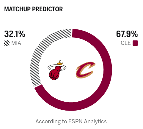 ESPN预测明日比赛:骑士胜率67.9%,热火胜率32.1%