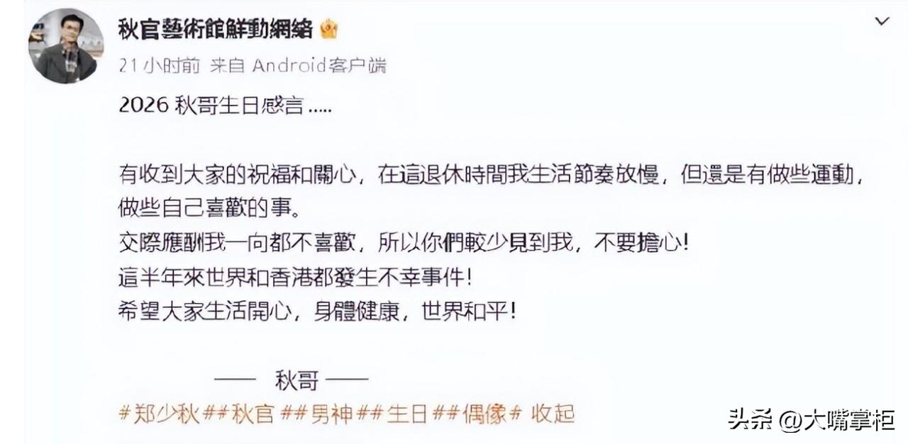 79岁的郑少秋,晚年的孤寂谁能懂? 3月24日,是郑少秋79岁生日,久未露面的他,发文称自己一切安好,感谢网友的祝福,只不过年岁渐大,他减少了一些不必要的活动,已经在享受退休生活,希望世界安好,网友安好。 不知不觉秋官都快80岁了,他这两年露面少,一方面是年龄原因,另一方面则是内心有困扰。 2023年9月,秋官的大女儿,也就是和卢慧茹的非婚生女郑安仪在美国自杀身亡,年仅55岁。 郑少秋和卢慧茹是初恋,但两人并没有走进婚姻,在郑安仪2岁时两人分手,卢慧茹带着郑安仪去了加拿大,后又去美国。郑安仪的整个成长过程,郑少秋是完全缺席的,除了资助一些费用,父女俩此后长达50年都没有联系,郑少秋曾说,就算两人在大街上碰面,可能都认不出。 在卢慧茹眼里,郑少秋是风流成性,否则两人也不会分手,可能是内心有伤痕,她时常在郑安仪面前诋毁郑少秋,幼年的郑安仪与郑少秋没有联系,她无法通过其他途径客观地去看父亲,一方面需要接受郑少秋的经济资助,另一方面又对这个父亲充满怨恨,这种常态,导致她成年后患上玉玉症,终生都差不多活在阴影里。 直到前几年,她渐渐释怀,尝试和郑少秋联系,也曾在2021年前往香港见了郑少秋一面,但长达几十年的情感空白,让这对父女无法建立真正的感情,两人见面比陌生人还尴尬。 而真正带走郑安仪的,则是失恋和孤独。 在美国,她常年孤身一人,母亲卢慧茹常年居温哥华,两人联系也很少,没有任何亲人系统的支持,而男友劈腿分手则成了压垮她的最后一根稻草。如果不是教会的教友多日联系不上她,她的离去恐怕至今无人知道。 大女儿的离世,对郑少秋的打击比较大,如果他尽到一些做父亲的责任,郑安仪可能不会这么早离开人世。另外二女儿郑欣宜,从2014年确诊重度玉玉症,到2023年再次因这个病无法工作,工作直接停歇两年。 两个小女儿,虽然郑少秋相对两个大女儿陪得最多,但总的来说也都很稀少,他们的成长岁月,郑少秋正忙于事业,对家庭对女儿同样疏忽比较多。 晚年的郑少秋,身体大不如从前,经常住院,大女儿不在了,二女儿自顾不暇,两个小女儿和他不亲,官晶华更信任护工,因此病房里长年只有他和护工,辛苦拍了一辈子戏,如今落得这么个光景,怎会有心情再顾其他。