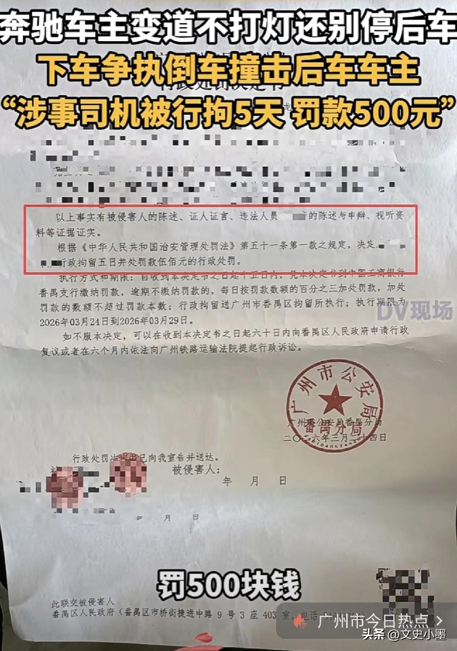 广州某街头,一男子驾车正常行驶中,突然前面的奔驰车想要向左变道超车,为了避免撞车,男子迅速打了一把方向盘躲过去了,他心里很气愤,摇下车窗对着奔驰车问:到底会不会开车啊! 谁知这奔驰车主不愿意了,觉得被人质疑车技很没面子,于是一脚油门跑到了男子车前,停了五六秒后才加速驶去。这几秒钟的停车仿佛在告诉男子,自己不是好惹的,也算为自己找回了面子! 男子心里虽然窝火,但仍继续行驶,突然他看到那辆奔驰车停在了前面,于是他便再次摇下车窗说:开车变道也不打指示灯,会不会开车啊!谁知,从奔驰车上下来两个人,对着男子车又骂又踹! 男子没敢下车,觉得好汉不吃眼前亏,在车上报了警,等警察叔叔来了再说吧!奔驰车主见男子不下车,踹了几下便打算开车走。这时男子下车挡在了奔驰车前面不让他走。 谁知奔驰车主竟然打算把挡在车前的男子撞开,第一次假装试探了一下被男子躲开了,第二次以为男子会躲开,结果男子也是一根筋不怕危险挡在车前,奔驰车把男子撞开之后逃跑了! 幸亏车速不快,男子并无大碍,只是受了轻伤!警察找到奔驰车后,认定奔驰车主是故意伤害,经过验伤,男子受伤比较轻,最终奔驰车主被拘留5天,罚款500元! 有人说:奔驰车主行为太危险,这个处罚结果有点轻。也有人说:肇事逃逸,危险驾驶,故意撞人,应该吊销奔驰车主驾照!您觉得呢!