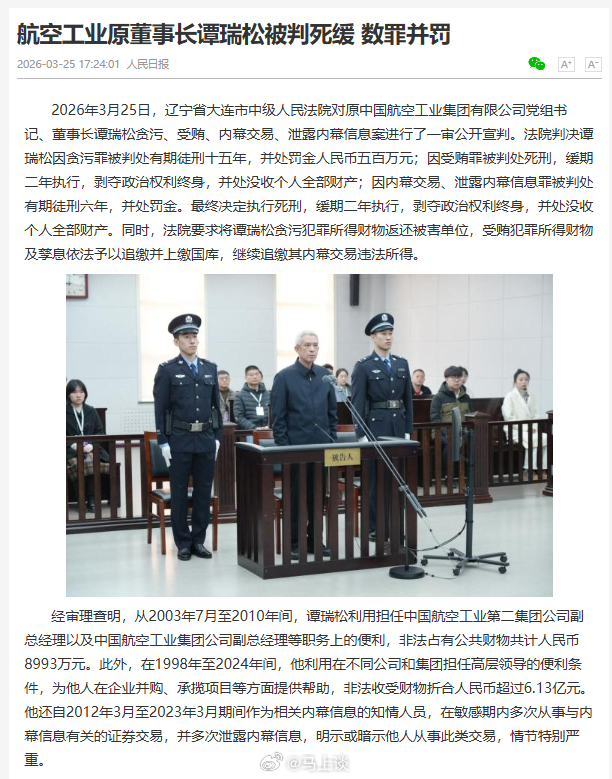 数罪并罚!中国航空工业集团原董事长谭瑞松一审被判死缓。